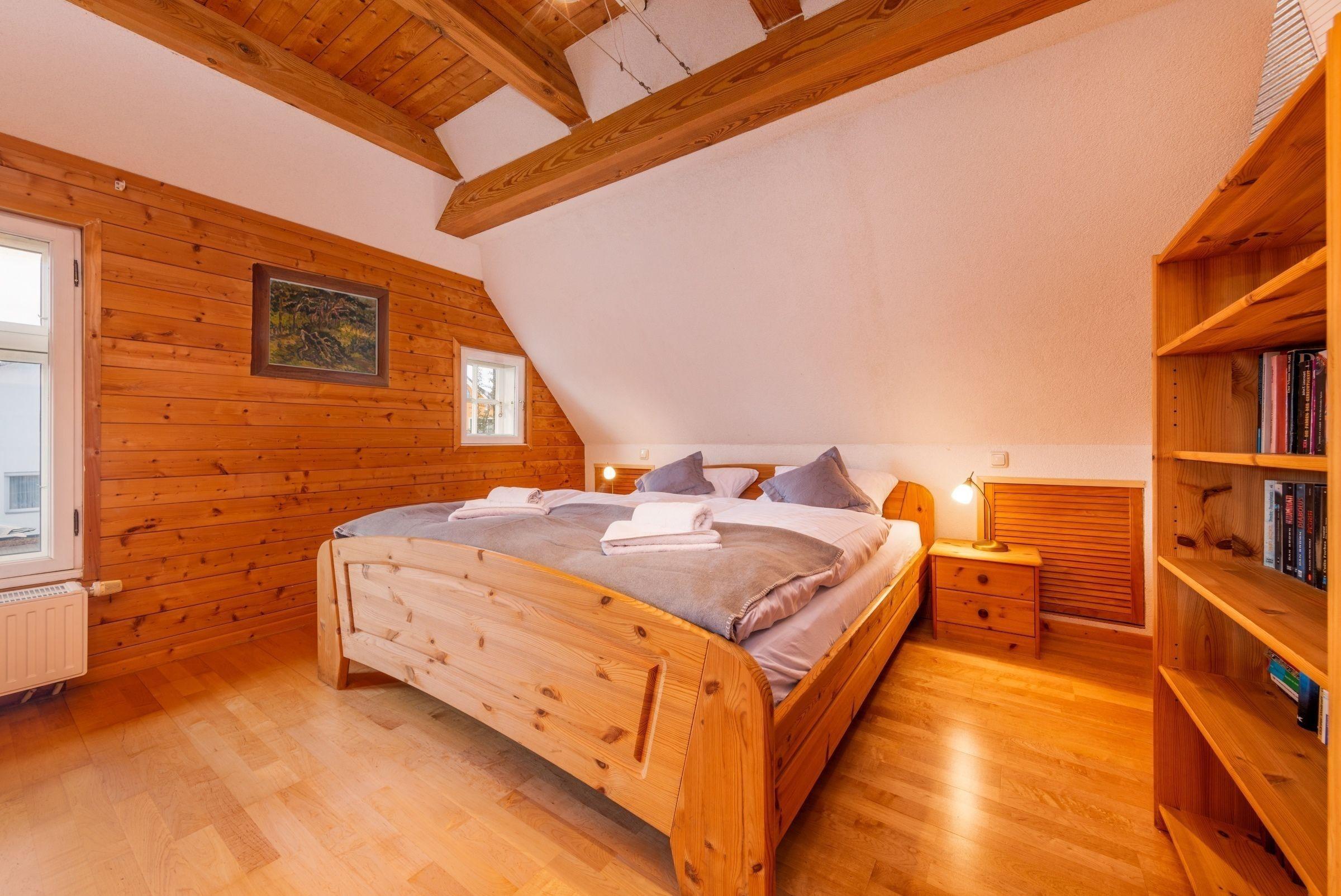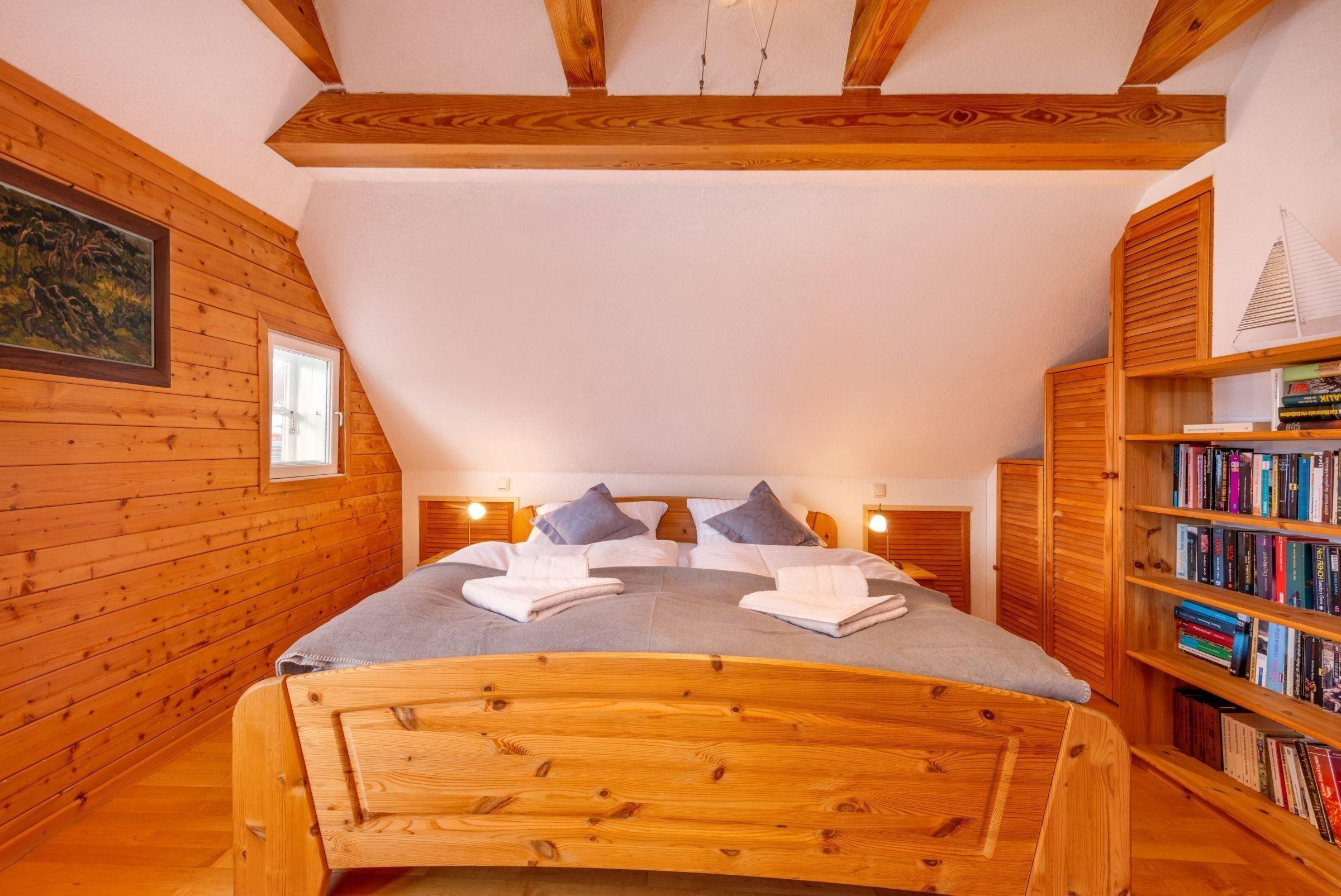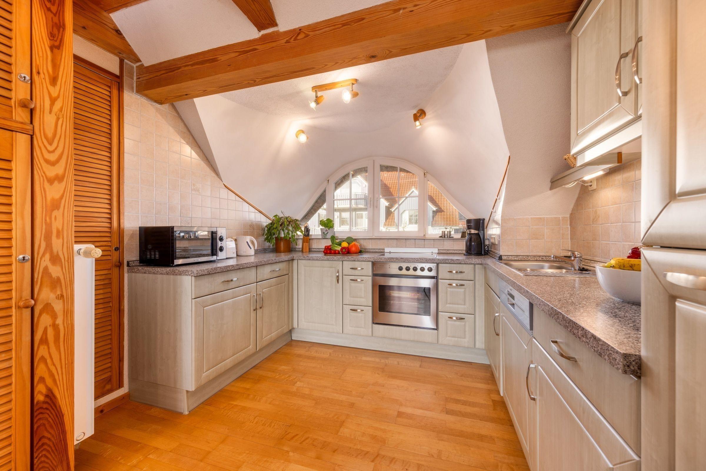 Die Ferienwohnung bietet mit zwei Schlafzimmern, einem Doppelbett und einem Einzelbett, ausreichend Platz für Erholungssuchende. Die offene Küche ist umfangreich ausgestattet, einschließlich Geschirrspüler, Elektro-/Gasherd, Backofen, Mikrowelle, Kühlschrank, Kaffeemaschine, Mixer, Eierkocher und Toaster. Ein Duschbad mit Fenster, Haartrockner und Badewanne sorgt für zusätzlichen Komfort.