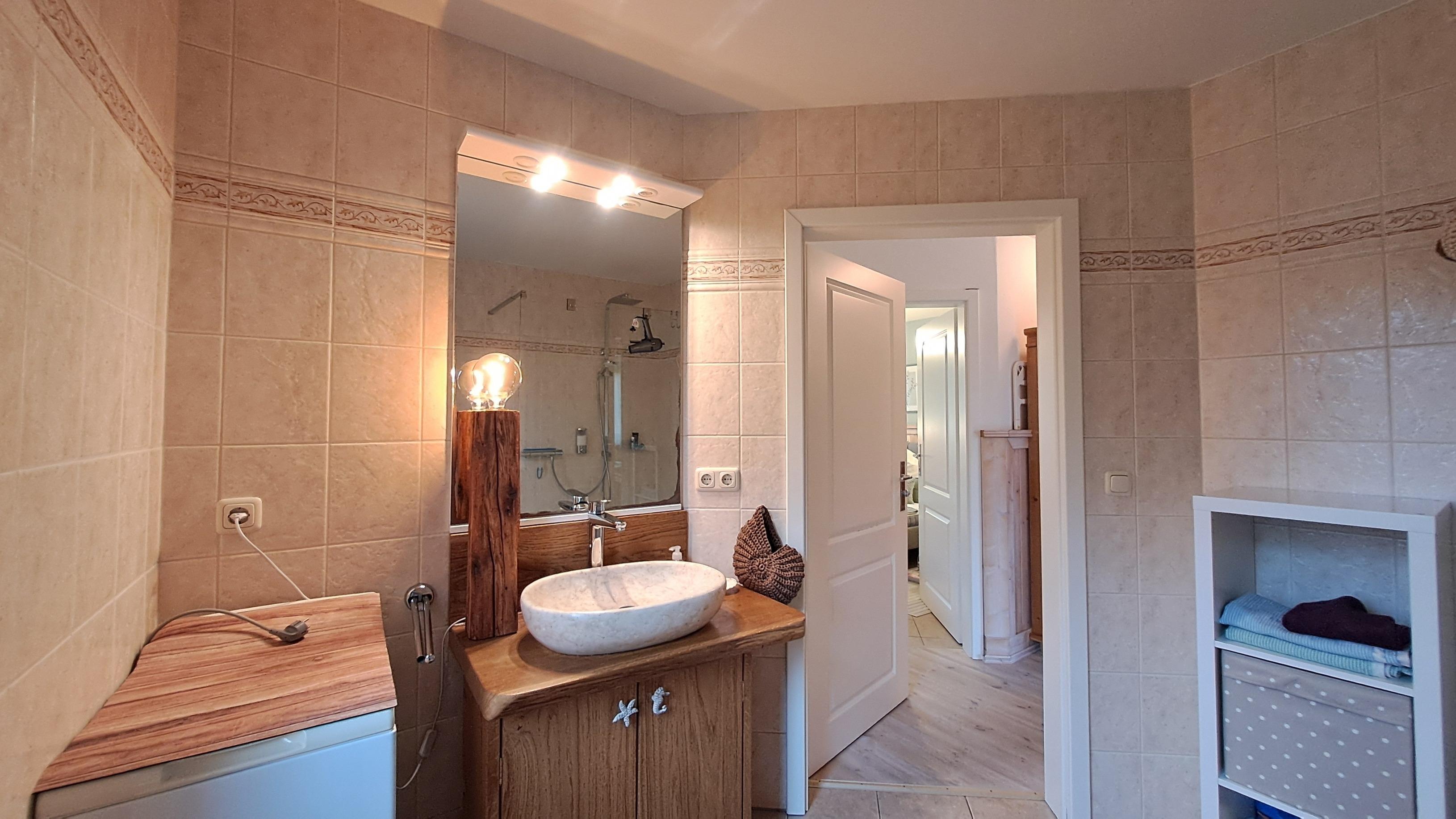 - Dusche, Waschbecken, Spiegel, Haartrockner, Waschmaschine und Wäscheständer