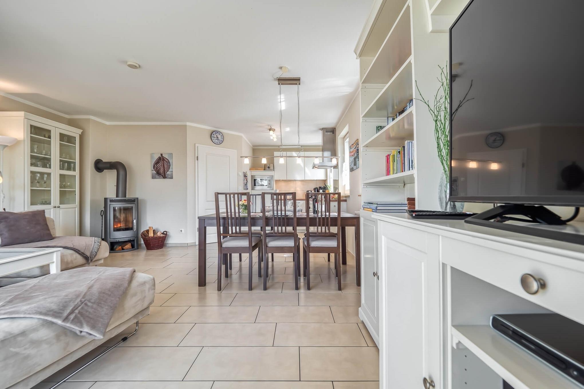 Im Erdgeschoss befinden sich die Küche mit Ceranfeld, Backofen, Mikrowelle, Kühl-Gefrierkombination, Spülmaschine, Essplatz, Wohnraum mit 50"Smart TV, Kaminofen und Sofa sowie Bad mit Dusche und WC.