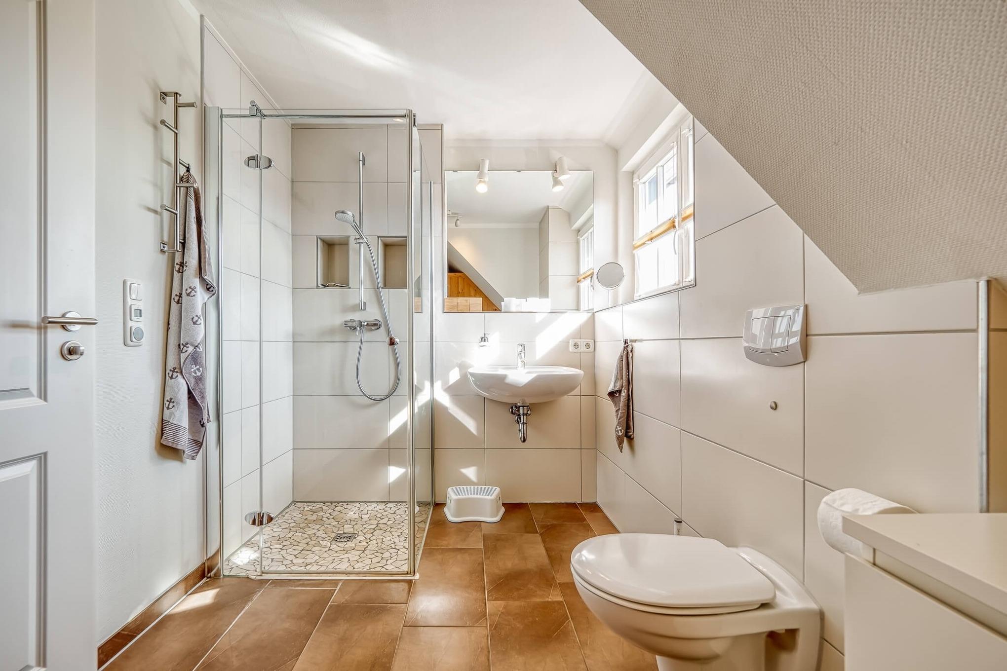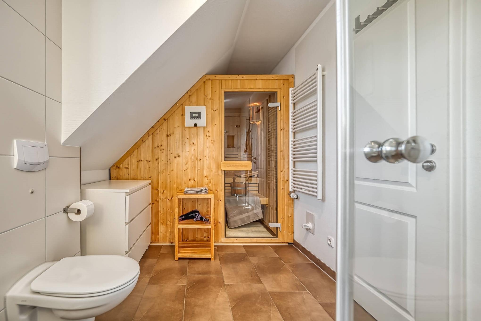 Im OG befinden sich das Bad mit Dusche/WC und Sauna sowie zwei Schlafräume (1 Doppelbett, 2 Einzelbetten).