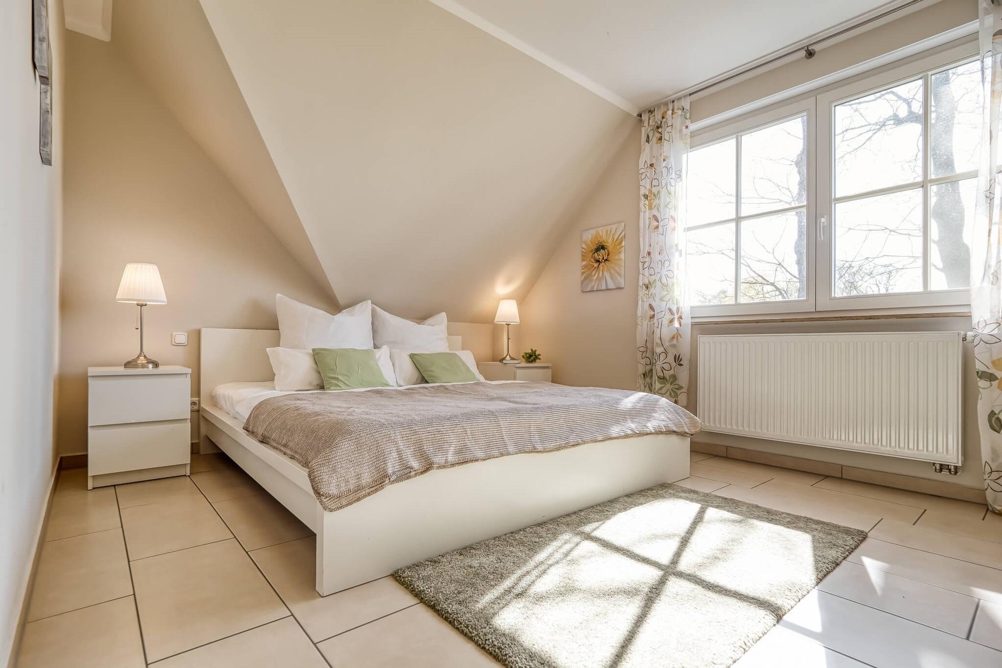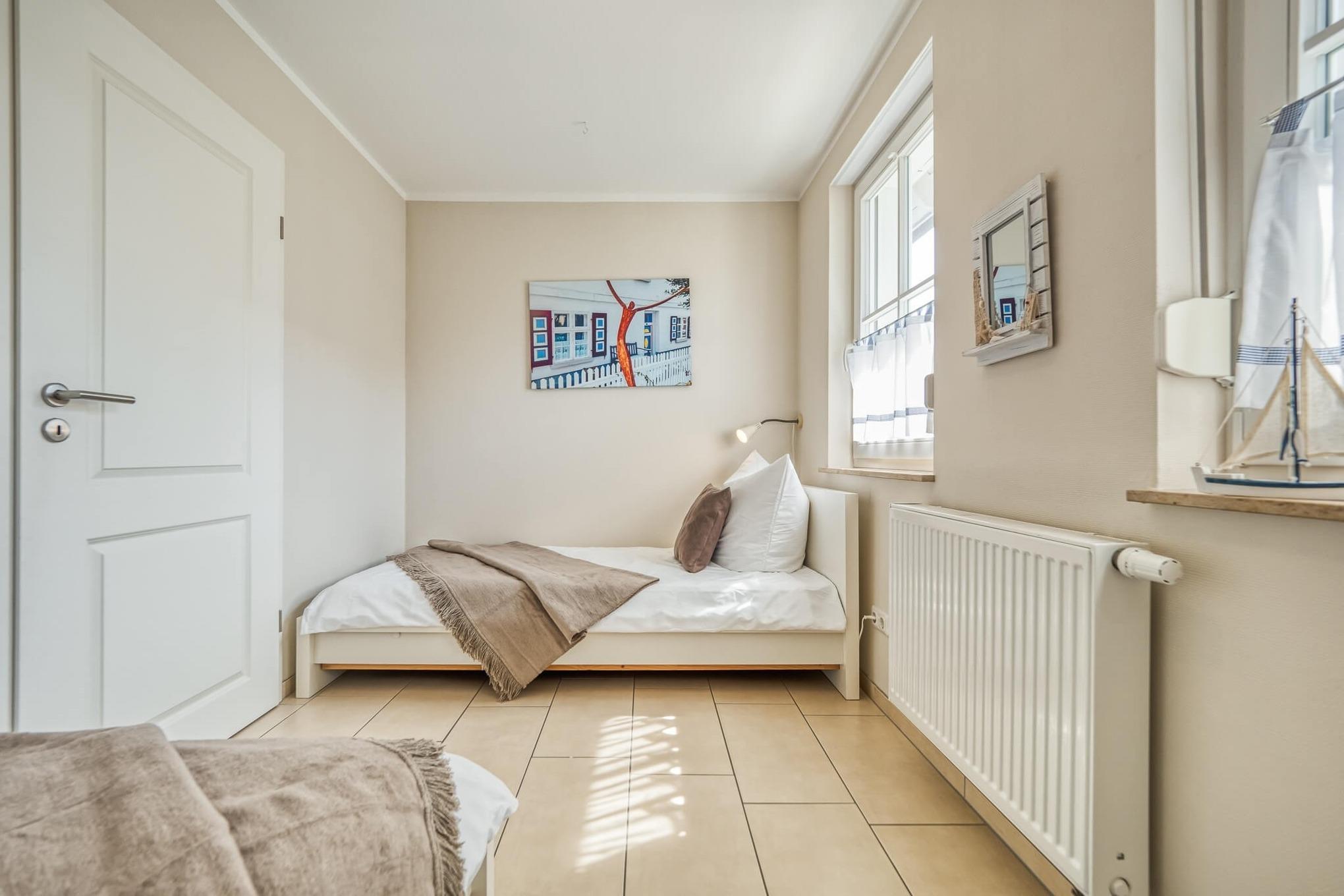 Im Dachgeschoss befindet sich der dritte Schlafraum mit zwei Einzelbetten. Kinderreisebett und Hochstuhl sind ebenfalls vorhanden.