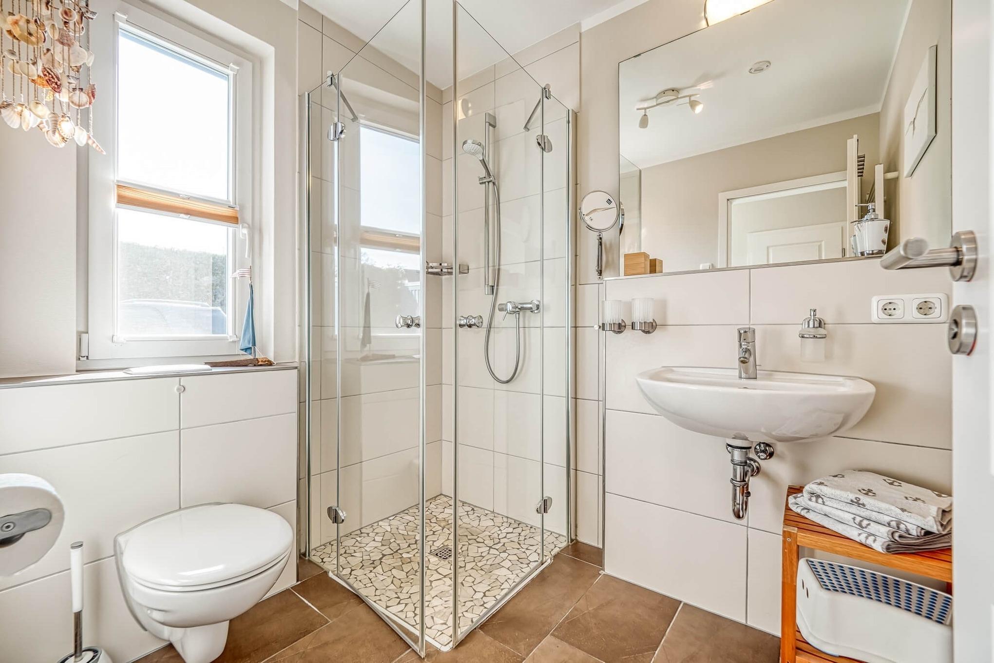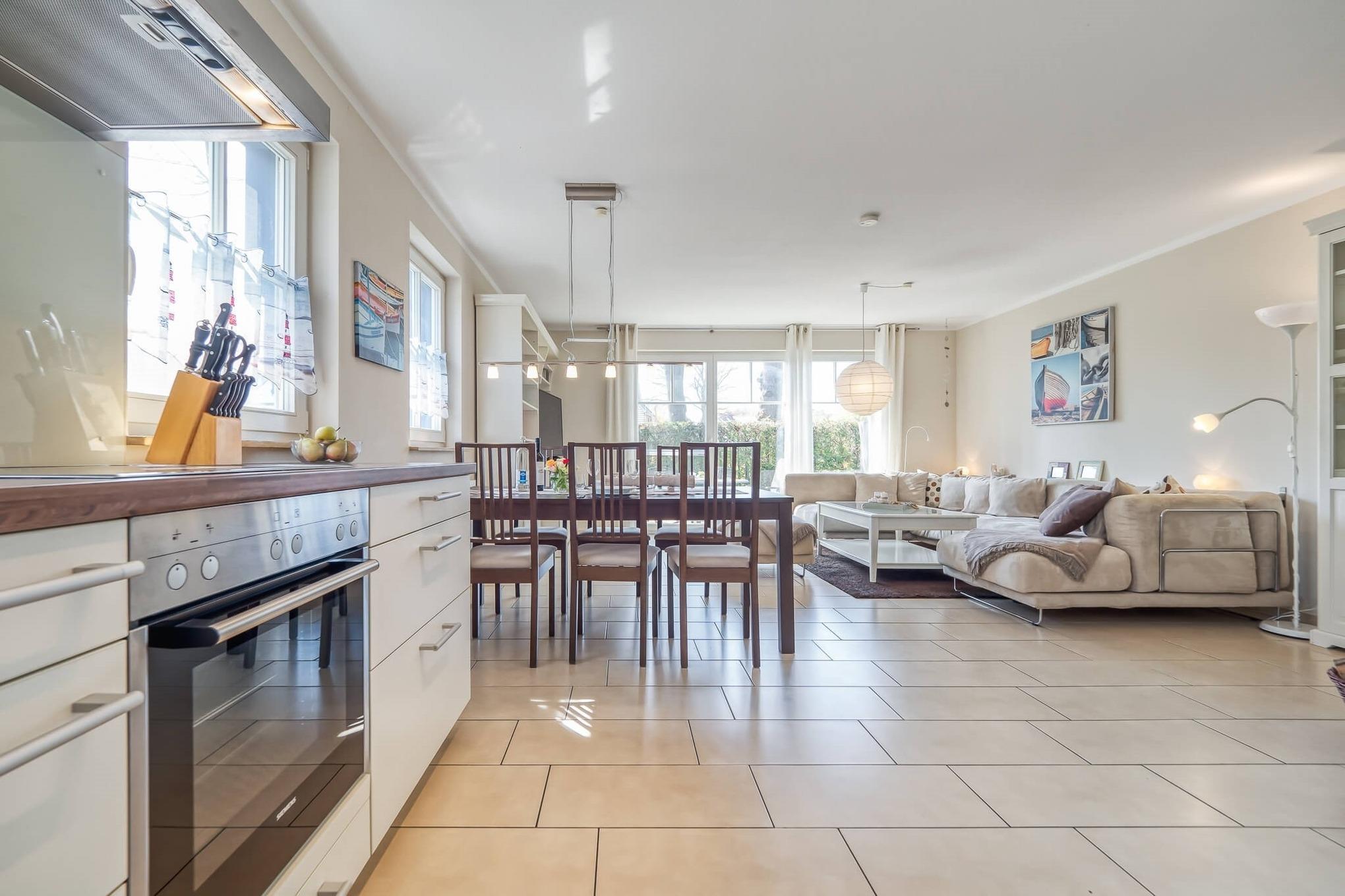 Im HWR steht eine Waschmaschine mit Trockner für Sie bereit. Alle Räume im EG haben Fußbodenheizung. Auf der nach Süd-Westen ausgerichteten Terrasse können Sie den Sonnenuntergang in bequemen Gartenmöbeln sowie einem Strandkorb genießen.
