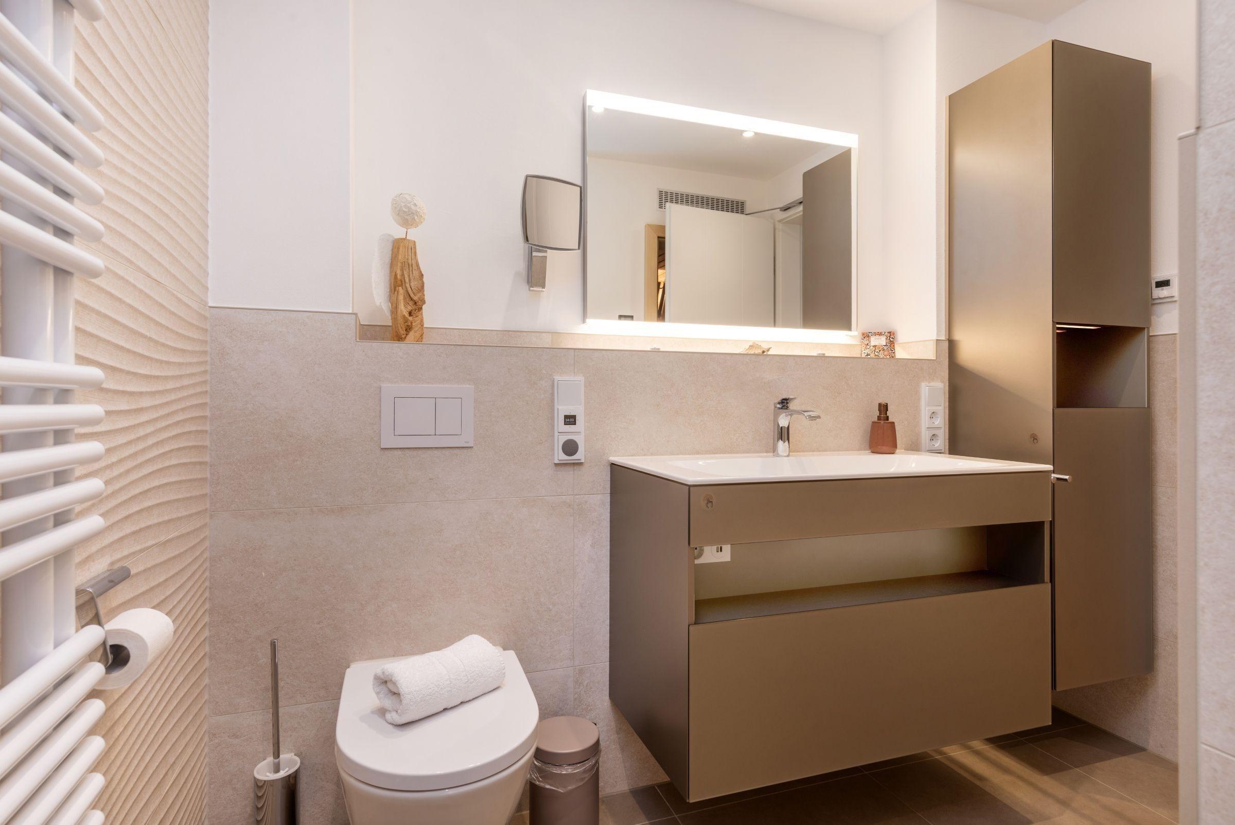 Zur Villa gehören zudem zwei private Parkplätze in der Tiefgarage sowie eine E-Ladestation. Der Zugang erfolgt bequem über einen Aufzug. Die ideale Wahl für Gäste, die Komfort und Strandnähe schätzen.