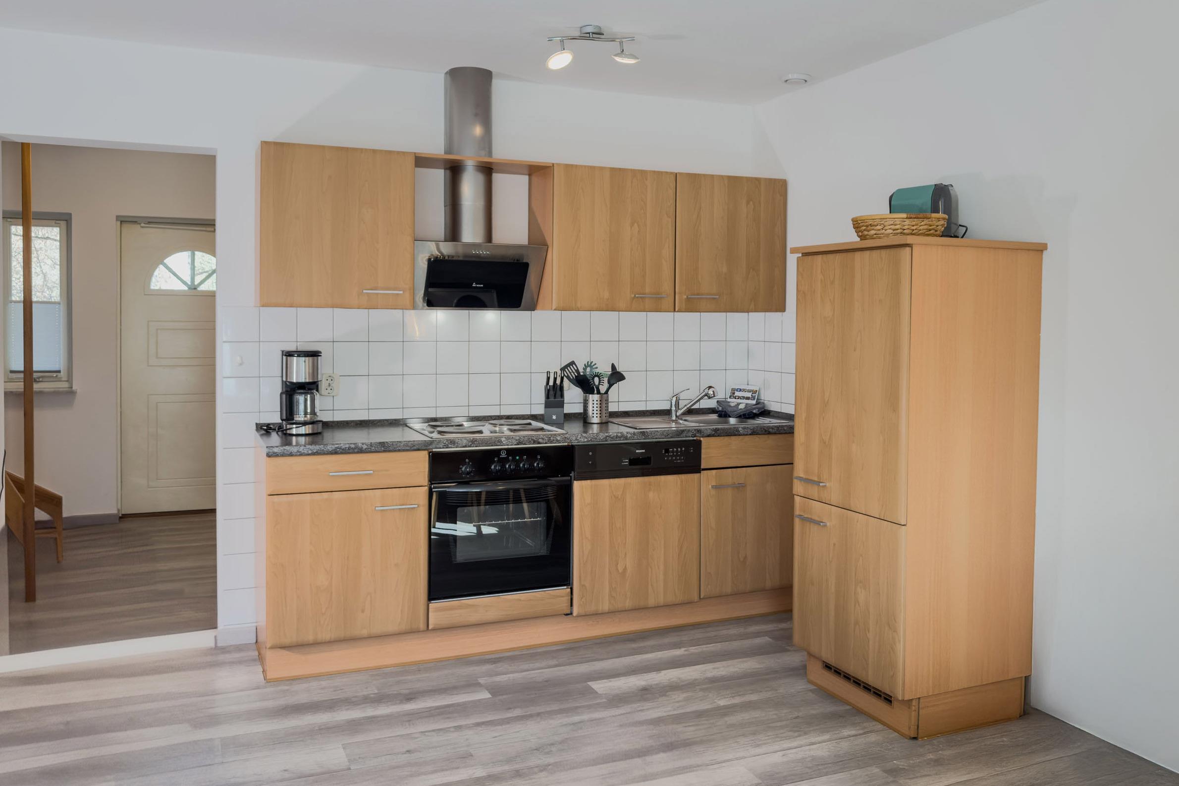 Voll ausgestattete Küche mit Geschirrspüler, Backofen, Kochfeld, Kühlschrank, Toaster und Wasserkocher