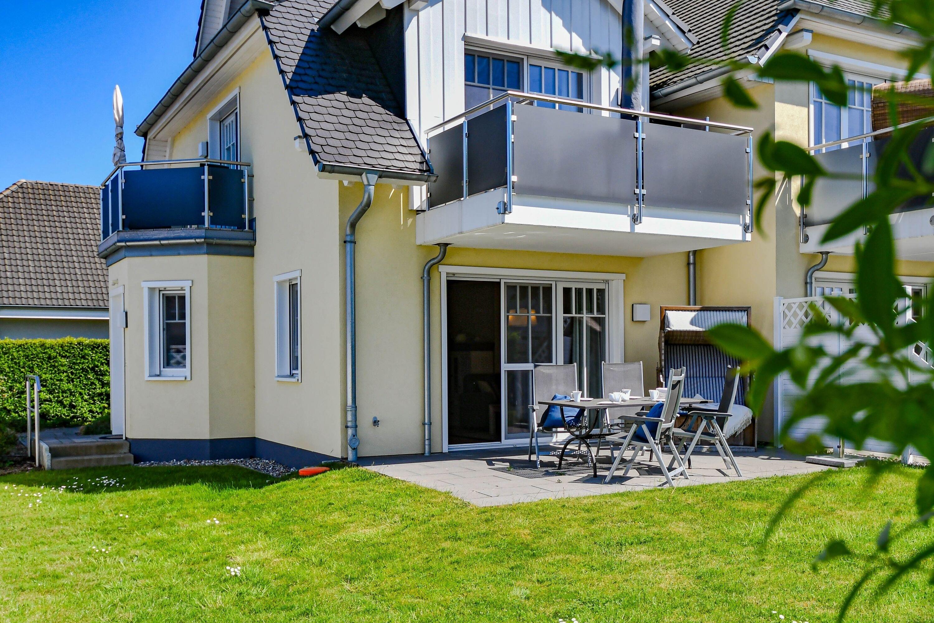 Große Terrasse mit Gartenanteil und eigenem Strandkorb – perfekt zum Sonnen und Entspannen