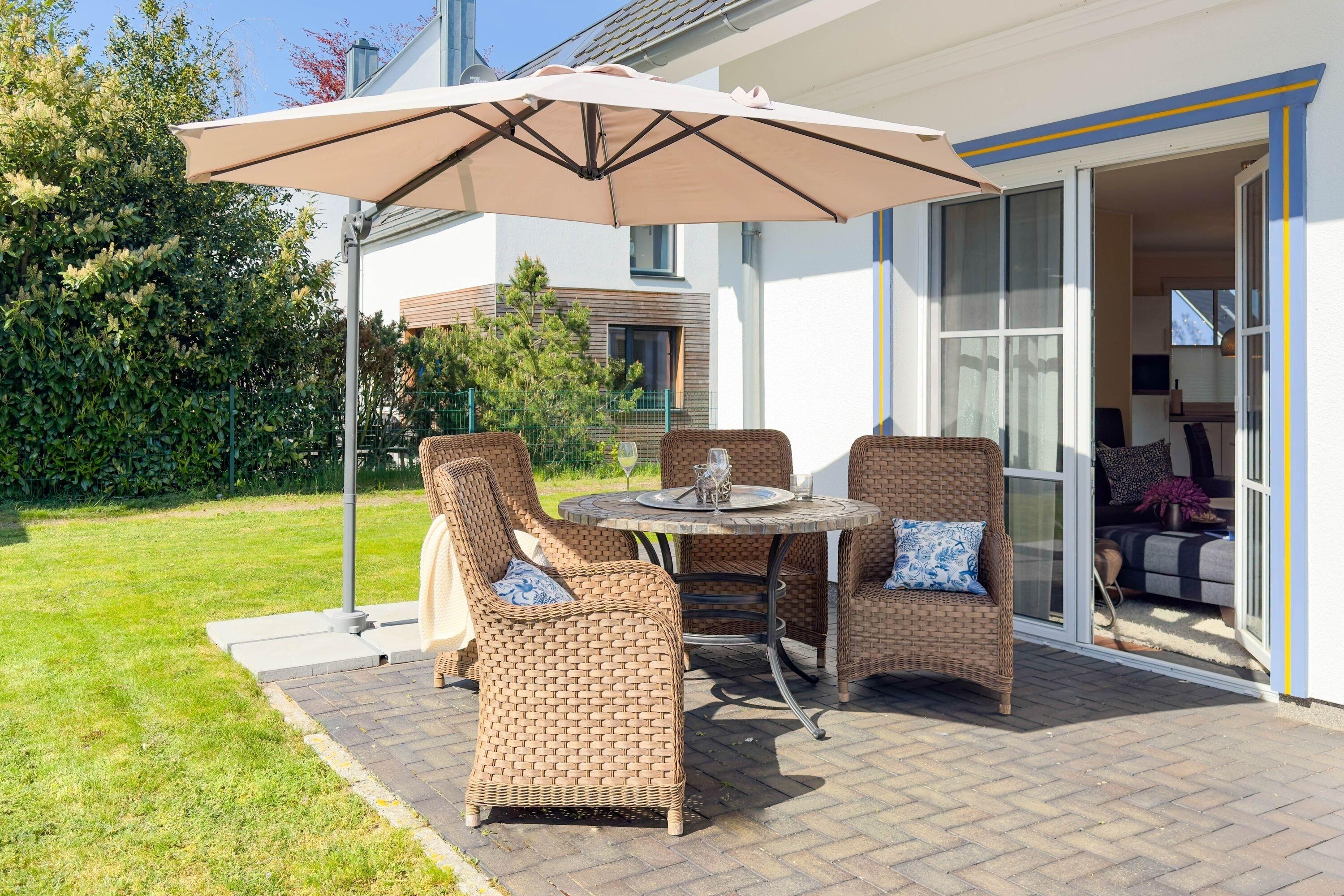 Südterrasse: Mit Blick auf Garten und angrenzenden Wald, ausgestattet mit bequemen Gartenmöbeln