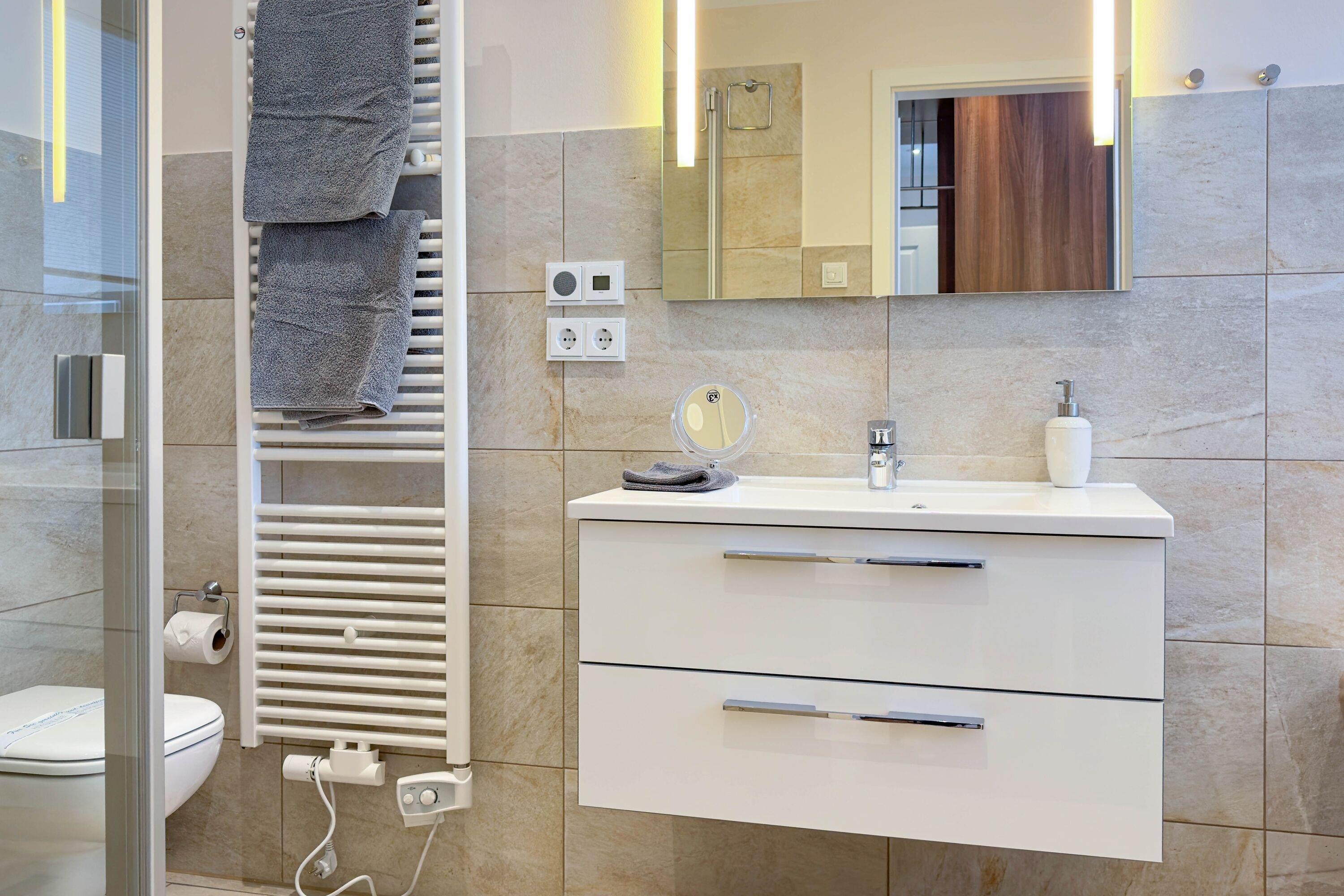 Zwei Badezimmer: Hauptbad mit Badewanne und Dusche, zweites Bad mit moderner, ebenerdiger Dusche