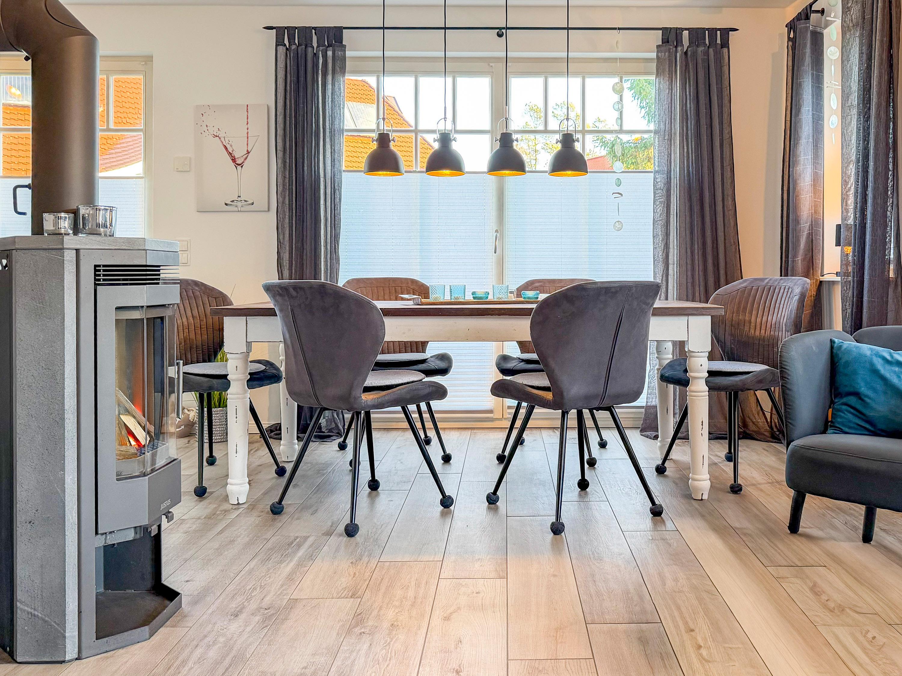 Das Dat Kroeger Hus empfängt Sie mit einer warmen und einladenden Atmosphäre. Der lichtdurchflutete Wohn-, Ess- und Küchenbereich im Erdgeschoss ist das Herz des Hauses und lädt zu entspannten Abenden ein – sei es bei einem guten Buch oder einem gemeinsamen Spieleabend. Die moderne Küche ist vollständig ausgestattet, sodass Sie mühelos köstliche Mahlzeiten für Ihre Liebsten zubereiten können.