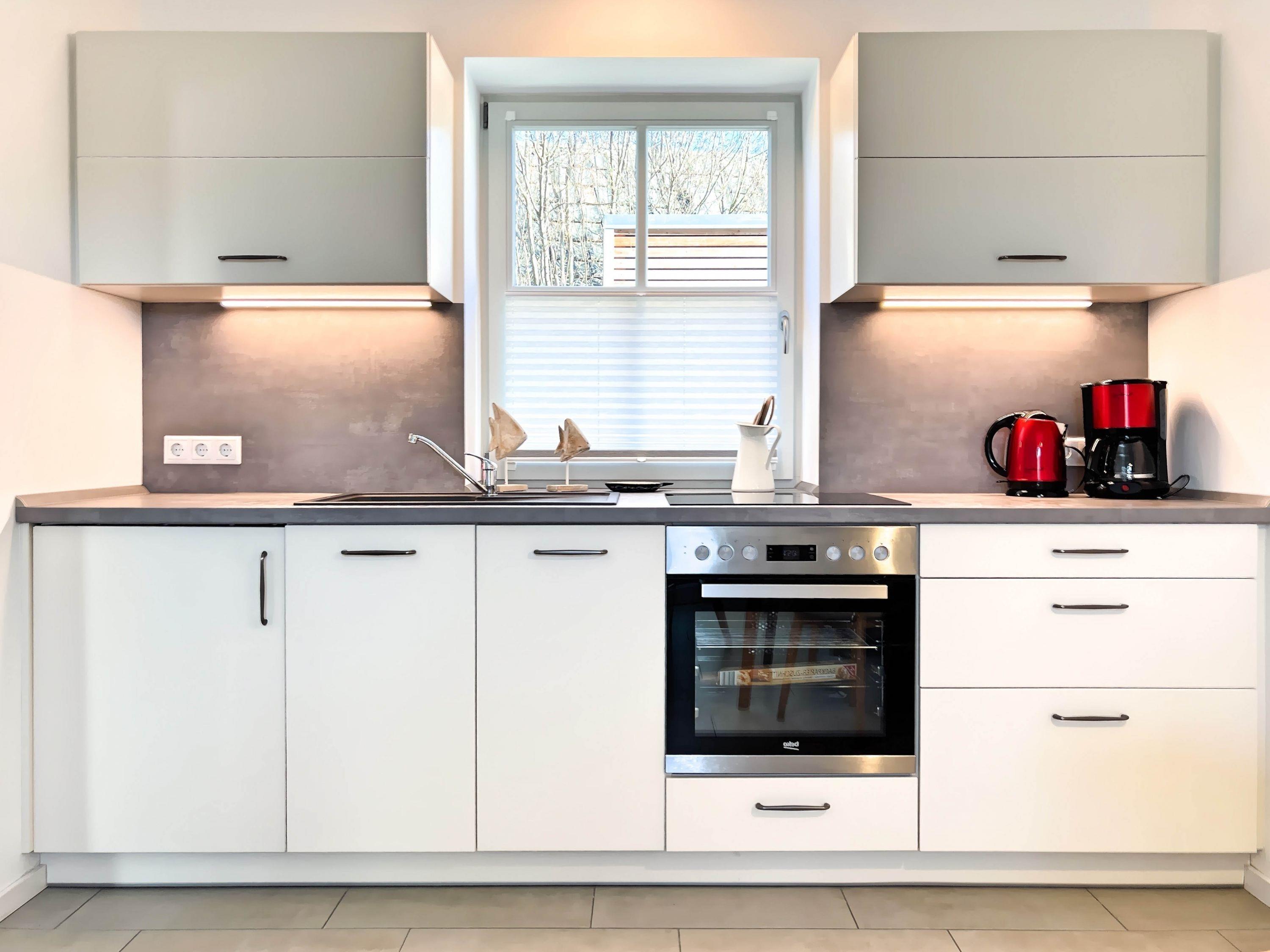 Voll ausgestattete Küchenzeile: Kochfeld, Backofen, Kühlschrank, Geschirrspüler und Filterkaffeemaschine