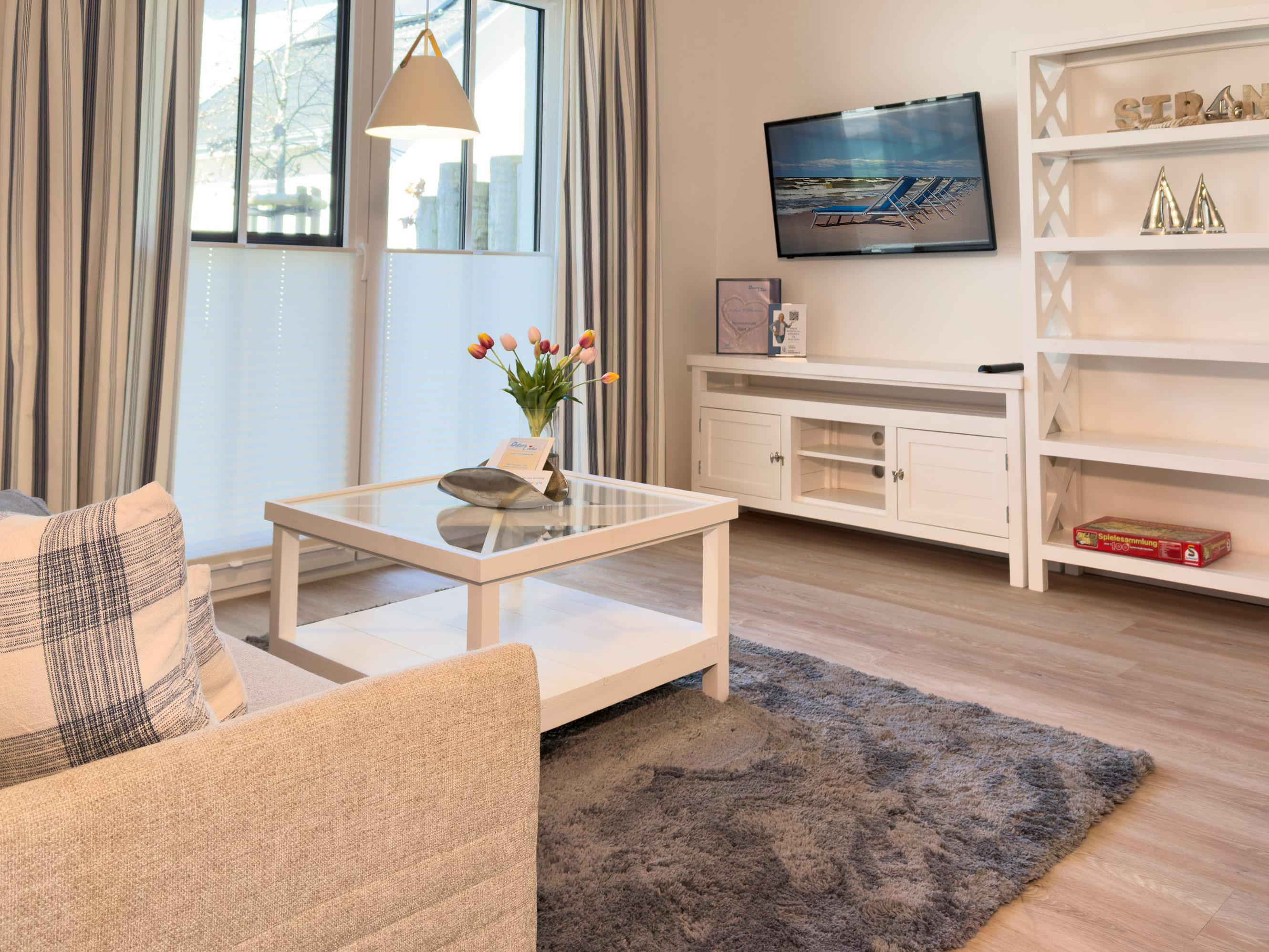 Nach einem Spaziergang am Strand lädt der behagliche Wohnbereich zum Entspannen ein – ob beim Lesen, Fernsehen oder einfach beim Wohlfühlen.