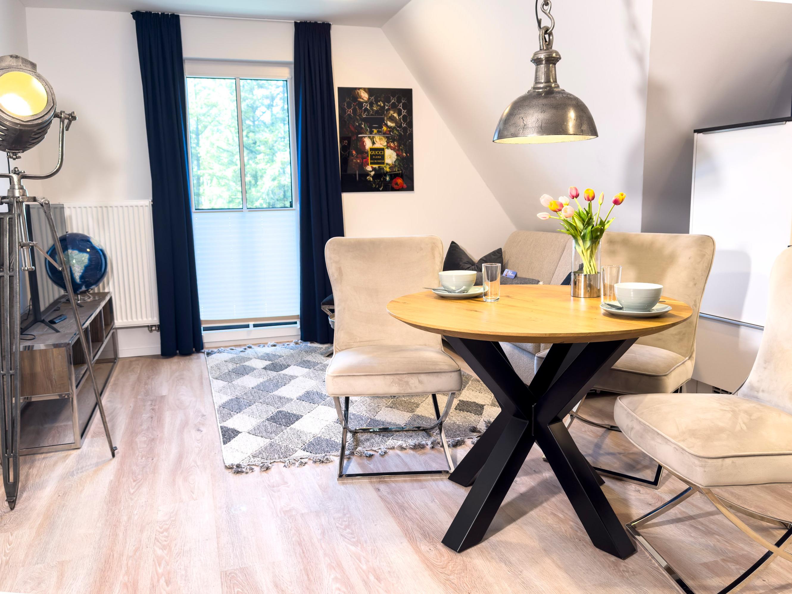 Hoch über den Gärten von Zingst gelegen, empfängt Sie die Ferienwohnung Möwenblick im ersten Obergeschoss der Anlage Düne 7 mit Leichtigkeit, Stil und einem Hauch von Meeresbrise.