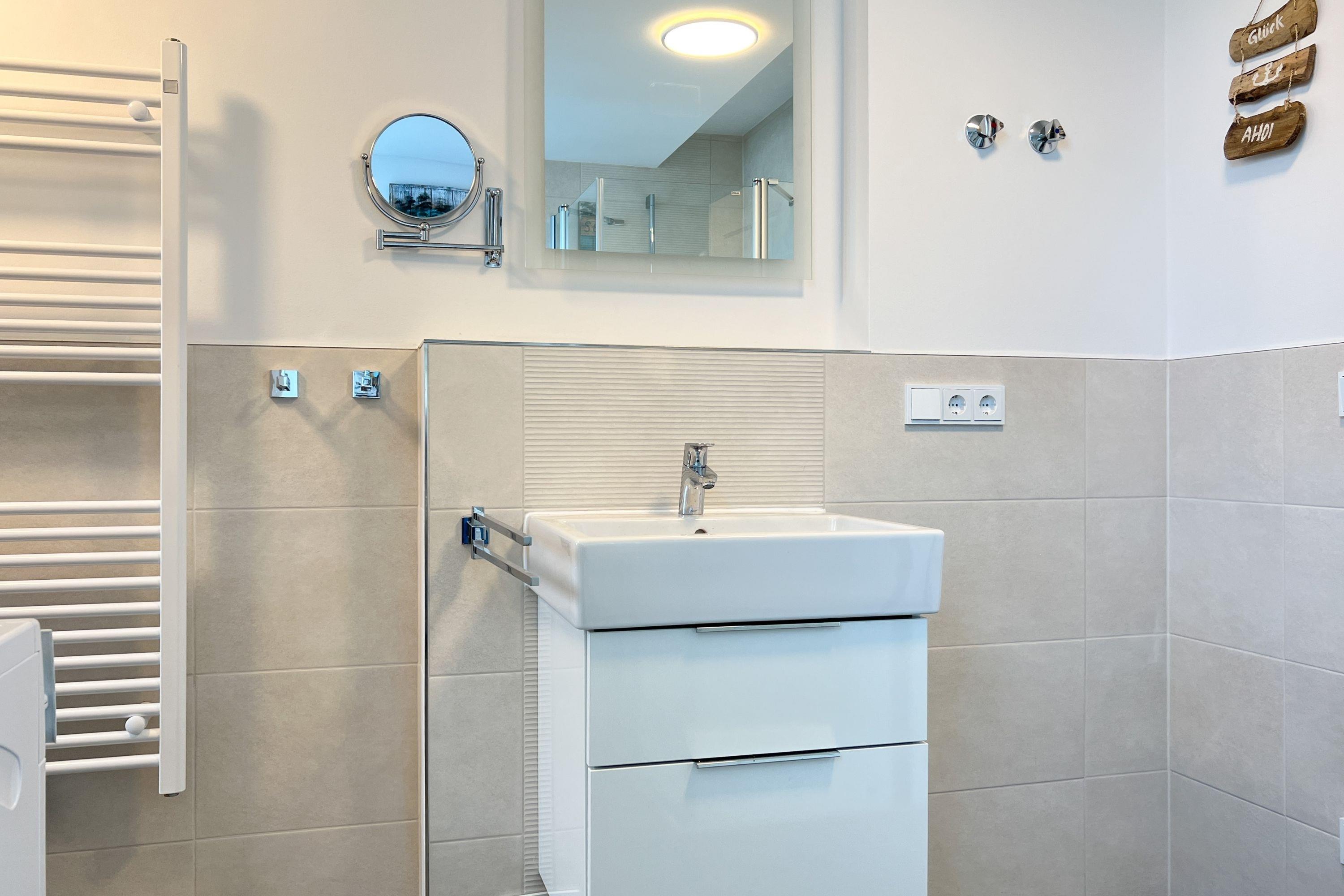 Modernes Badezimmer mit ebenerdiger Dusche, Fußbodenheizung und Haartrockner