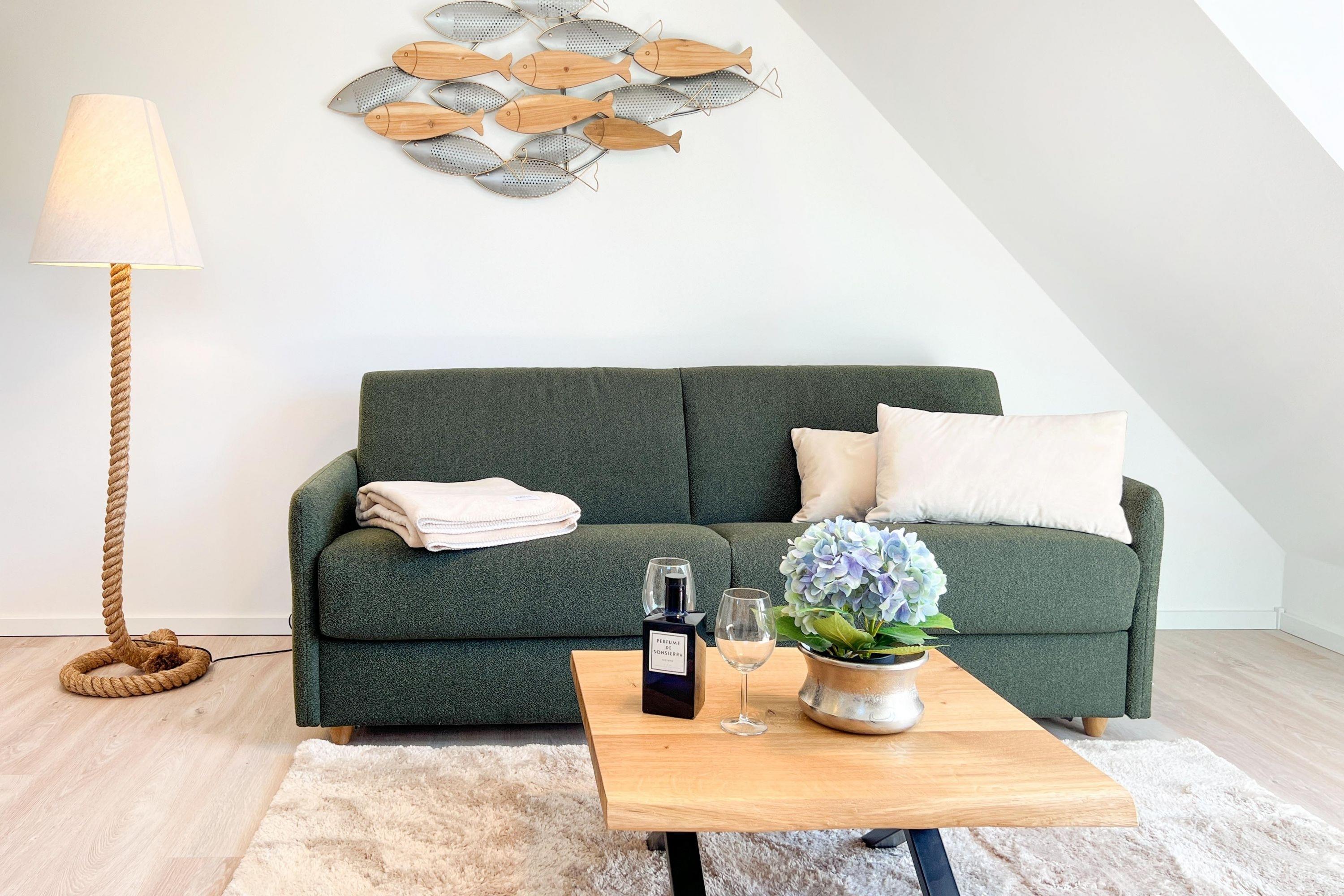 Nach einem Spaziergang am Strand oder einem Tag in der Natur lädt der Wohnbereich zum Entspannen ein.