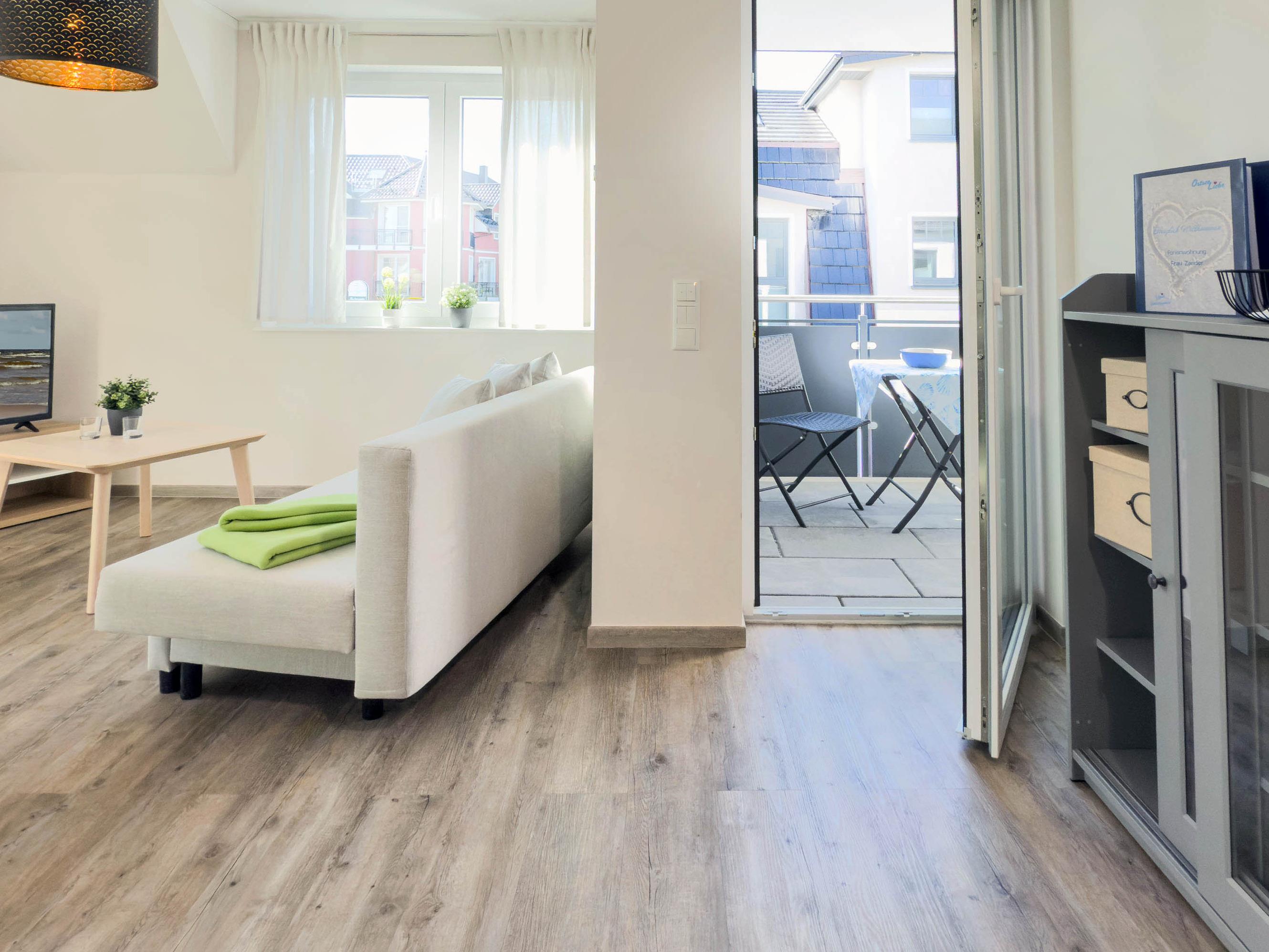 Wohnbereich: Heller Wohnraum mit bequemer Sitzgruppe, Smart-TV und Zugang zum Balkon für entspannte Stunden.