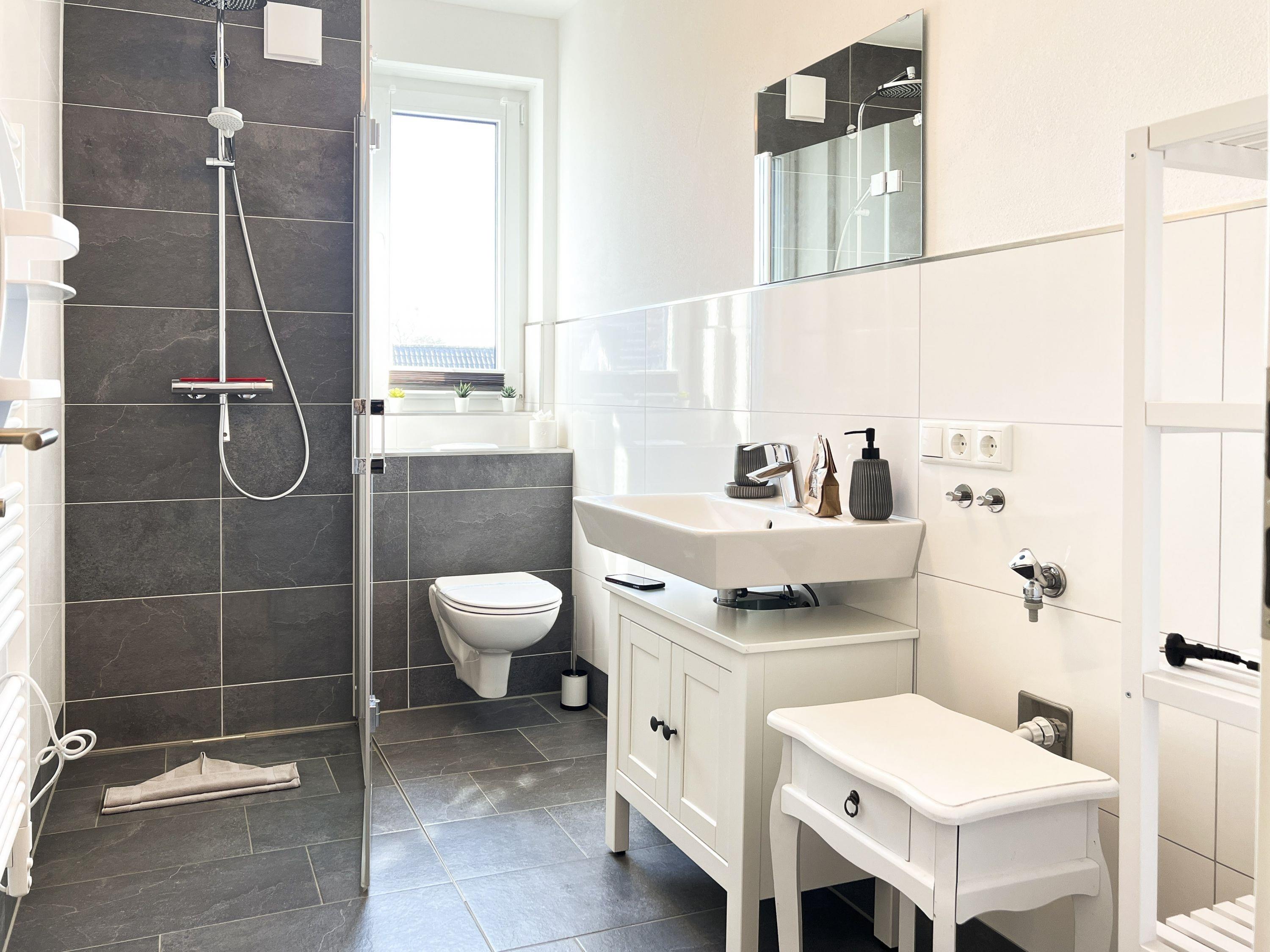 Badezimmer: Modernes Bad mit bodentiefer Dusche, WC, Haartrockner und Fußbodenheizung für zusätzlichen Komfort.