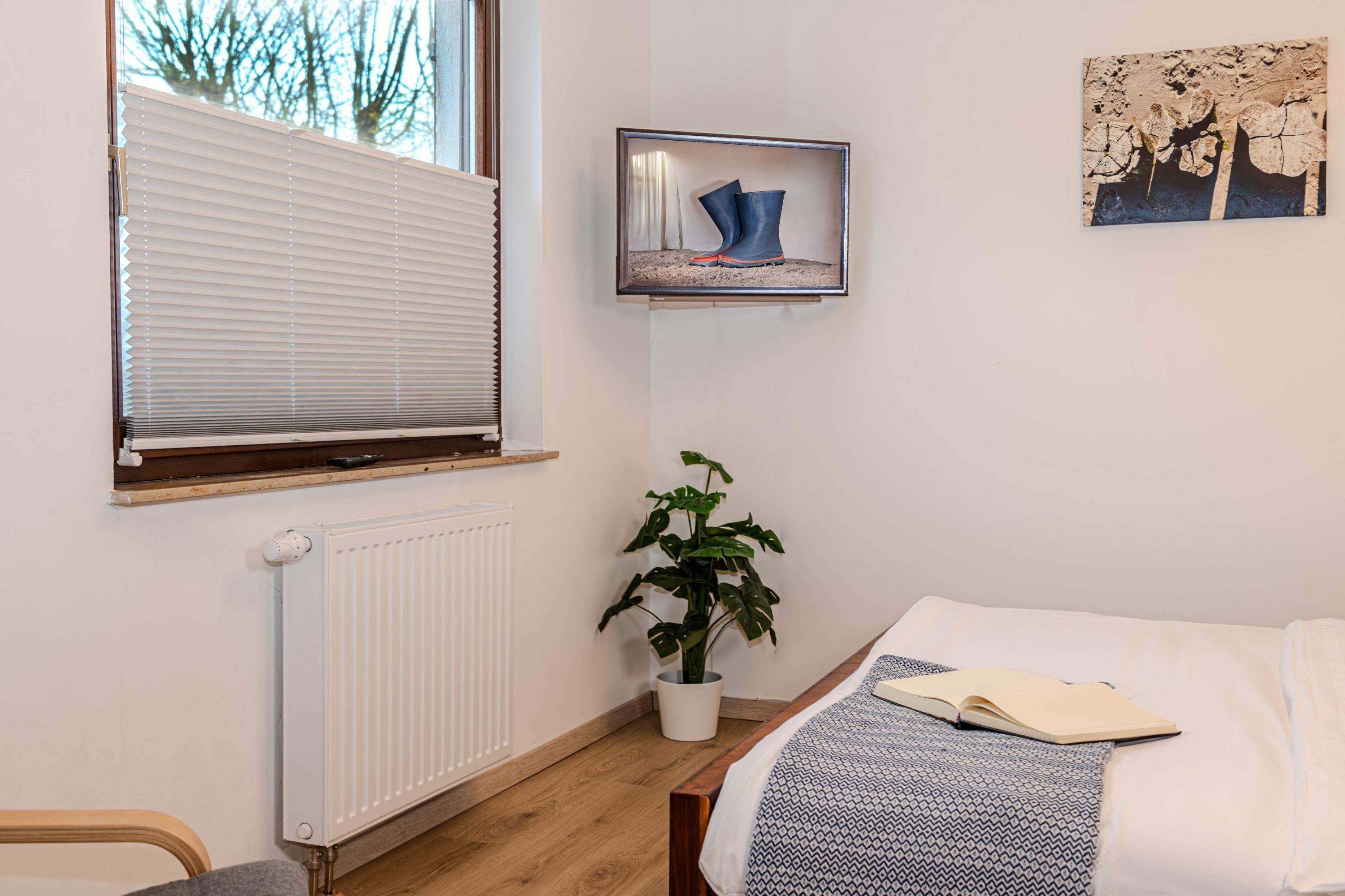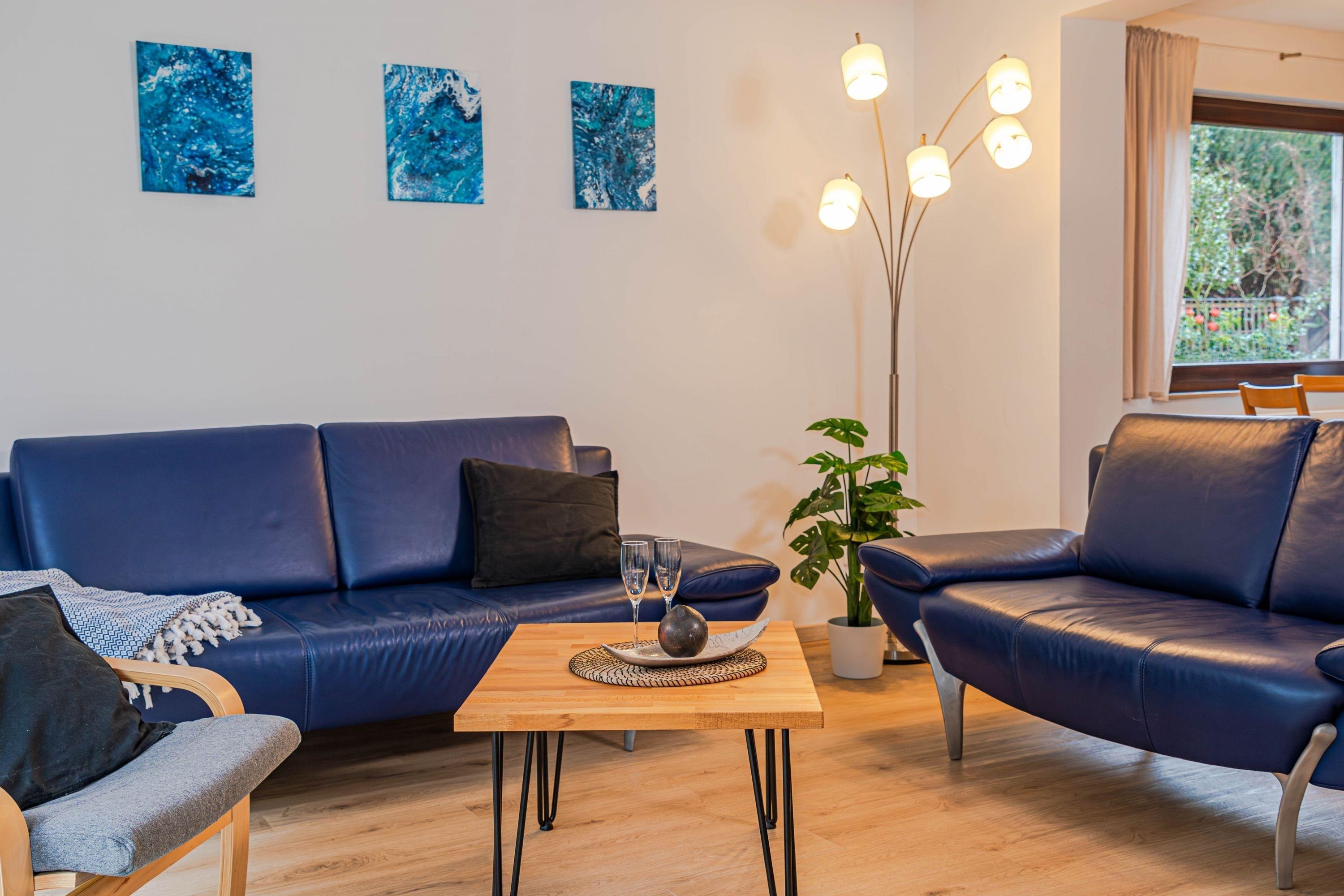 Gemütlicher Wohnbereich mit Smart-TV und Blick in den Garten