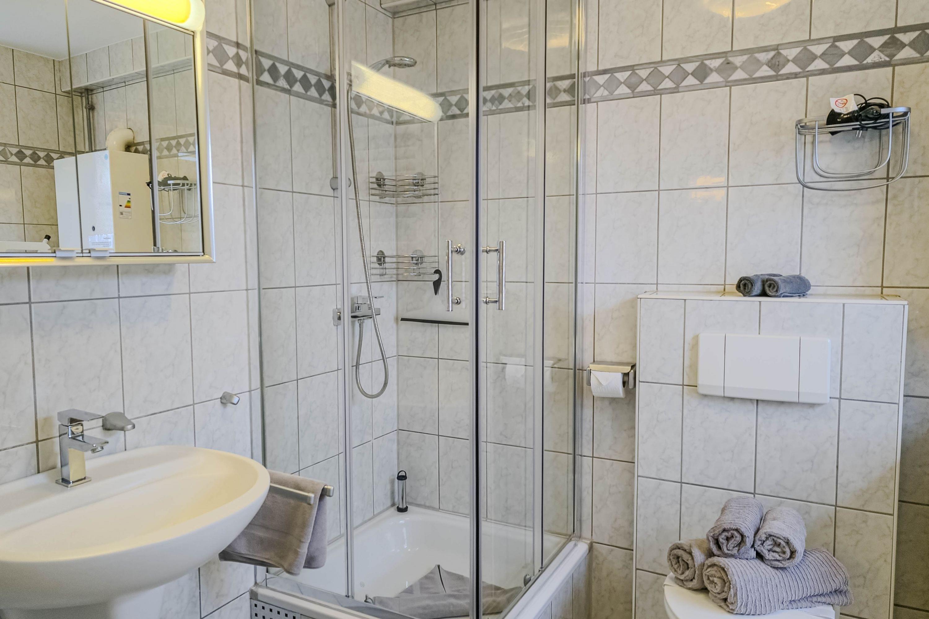 Badezimmer mit Dusche, Bidet und Handtuchtrockner