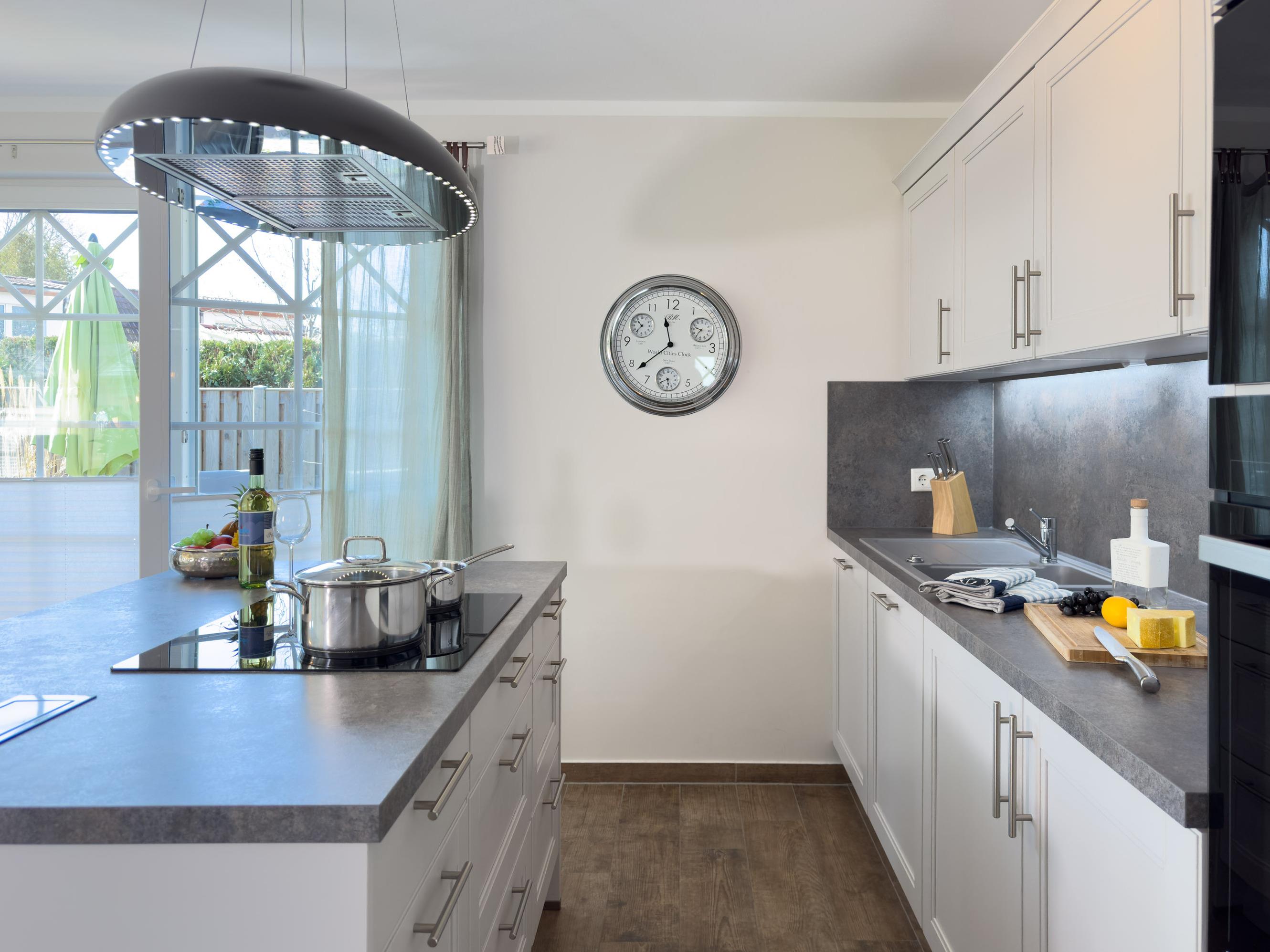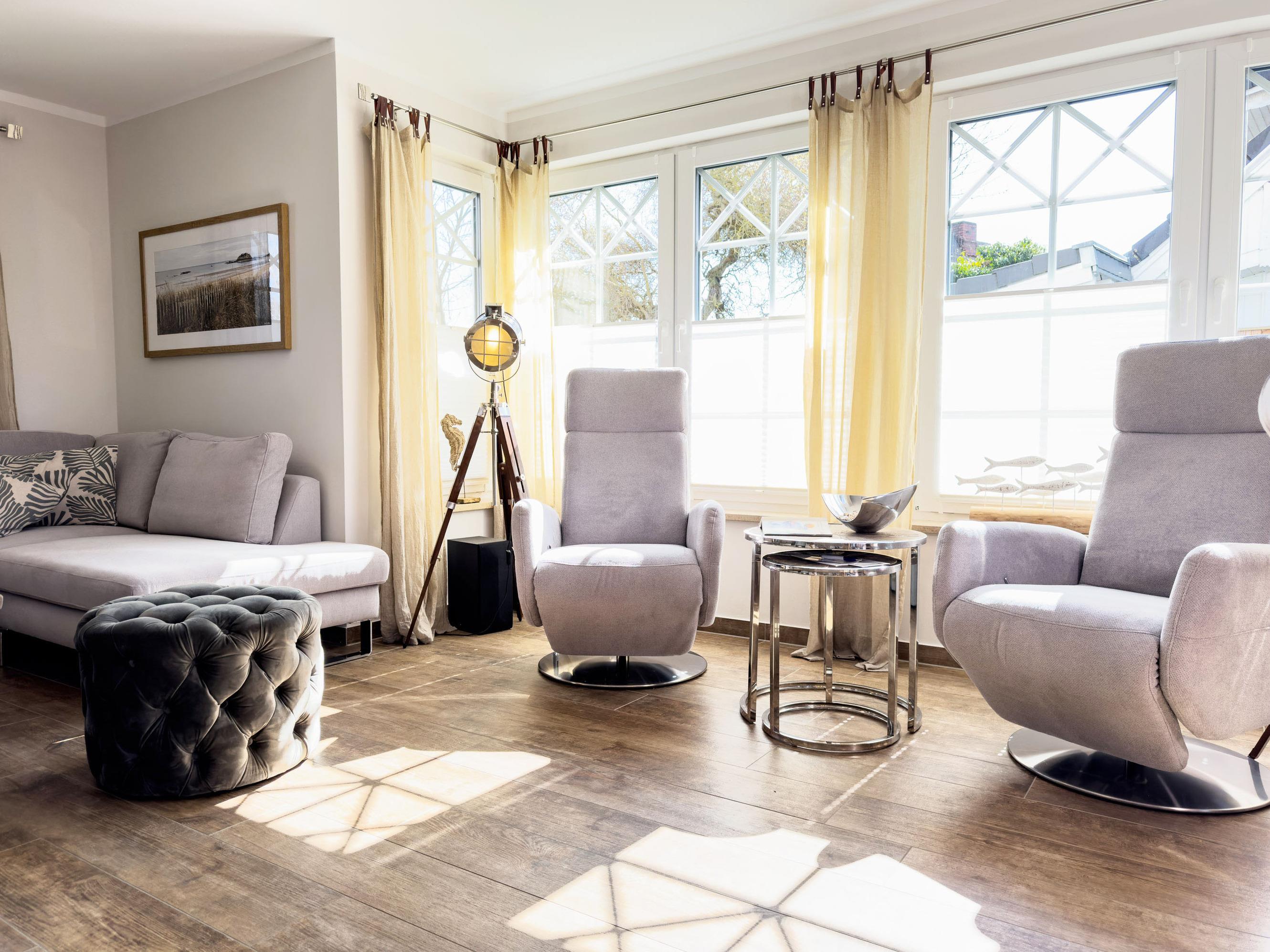 Die offene Küche mit Kochinsel lädt zu geselligen Kochabenden ein, während der große Esstisch genügend Platz für alle Gäste bietet. Das Wohnzimmer mit Kamin schafft eine behagliche Atmosphäre, ideal für entspannte Stunden nach einem Tag am Strand. Die drei Schlafzimmer im Obergeschoss versprechen höchsten Komfort mit luxuriösen Boxspringbetten und eigenem TV.