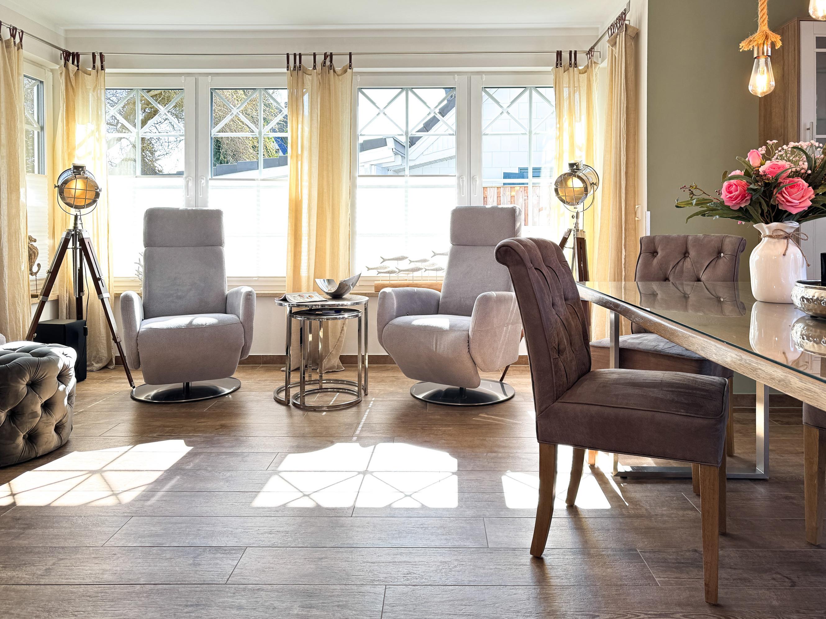 Wohnzimmer mit Kamin: Bequeme Relaxsessel, komfortable Couch und ein großer TV für entspannte Abende.