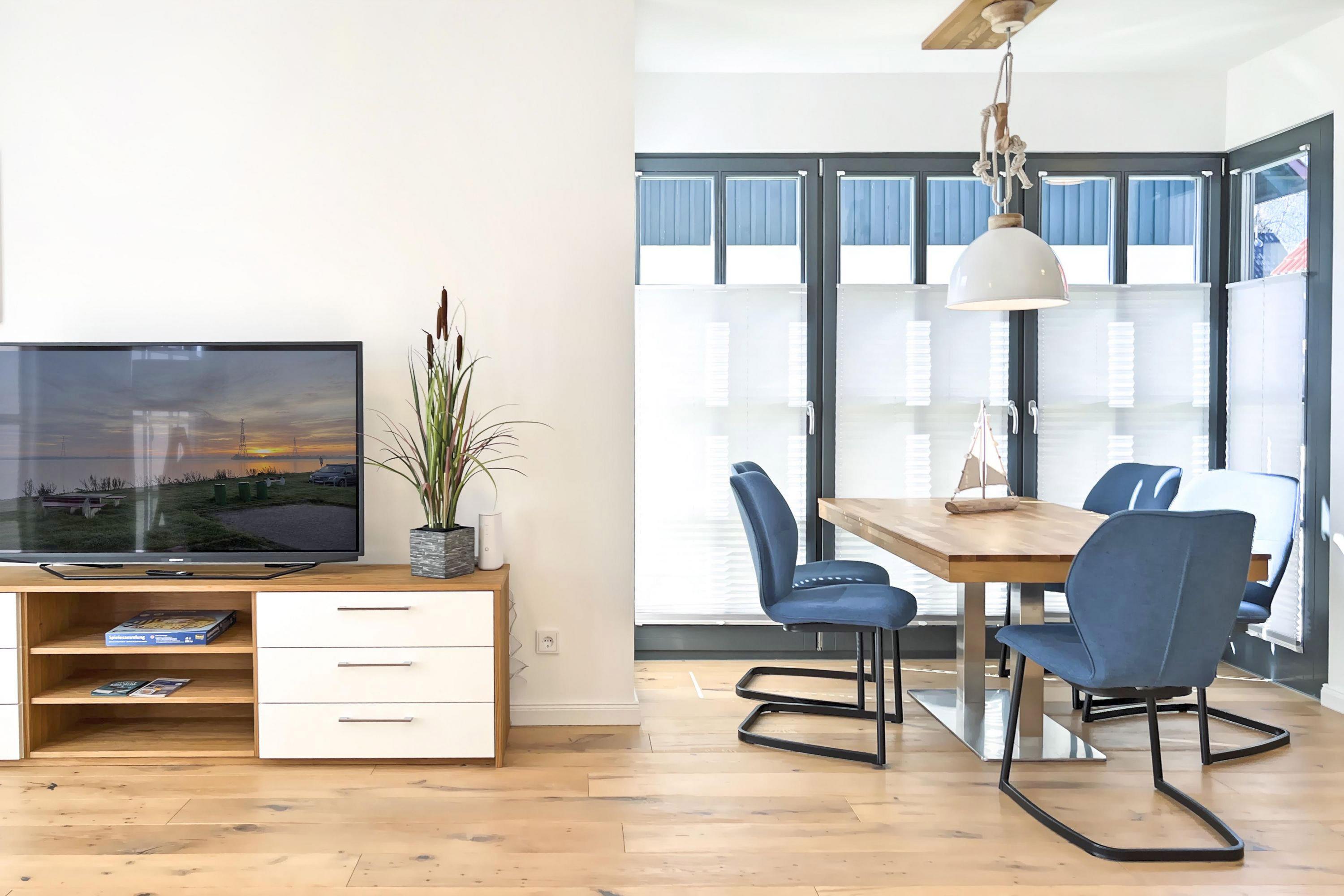 Das Wohnzimmer lädt mit einem gemütlichen Kamin, Sofas und Sesseln zu entspannten Stunden ein – ideal für kühle Abende mit einem Buch oder Film. Die offene Küche ist mit allem ausgestattet, um kulinarische Highlights zu zaubern, während der Essbereich Platz für die ganze Familie bietet.