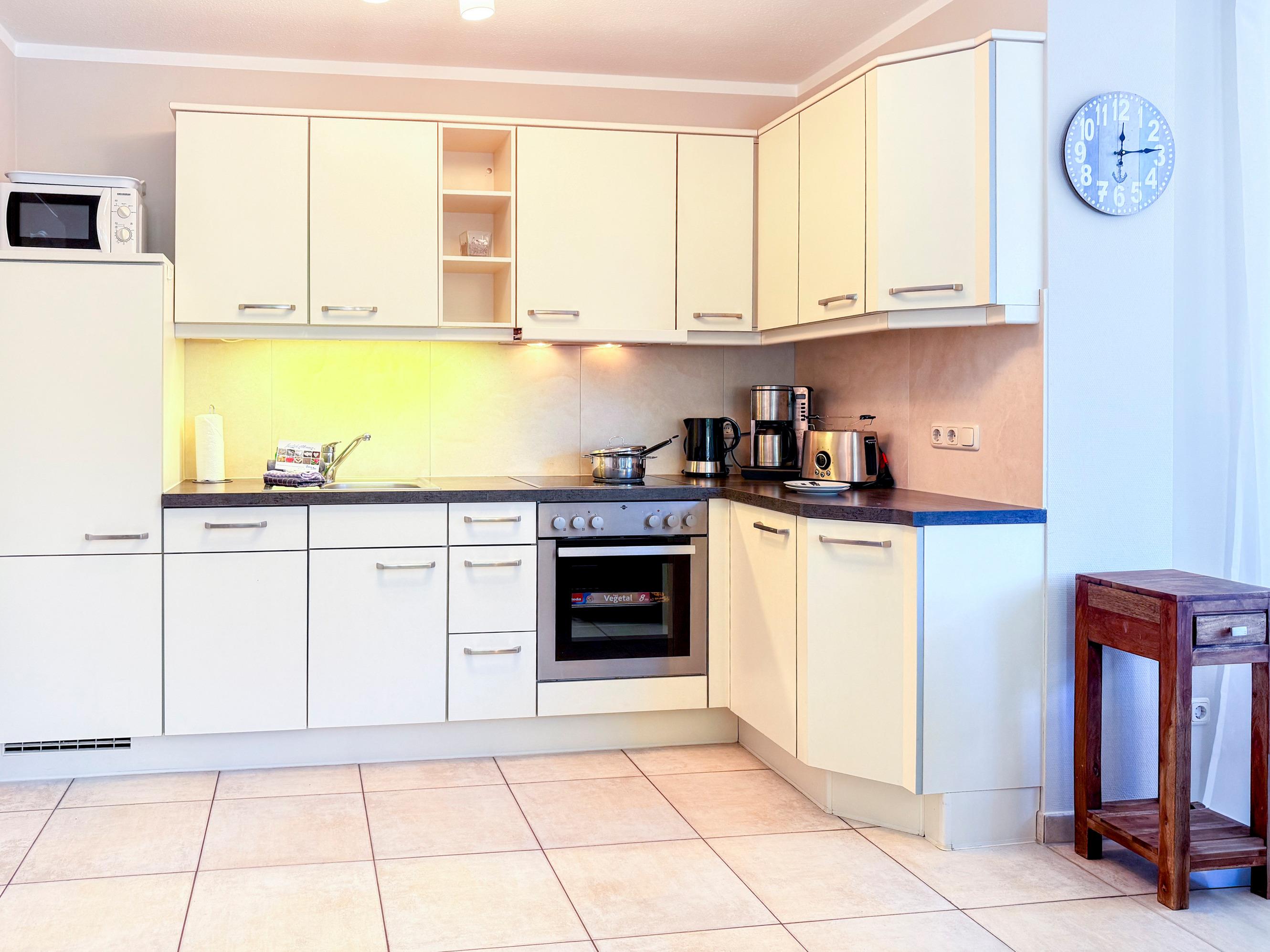 Separate Küche mit Spülmaschine, Backofen, Mikrowelle und Kühlschrank