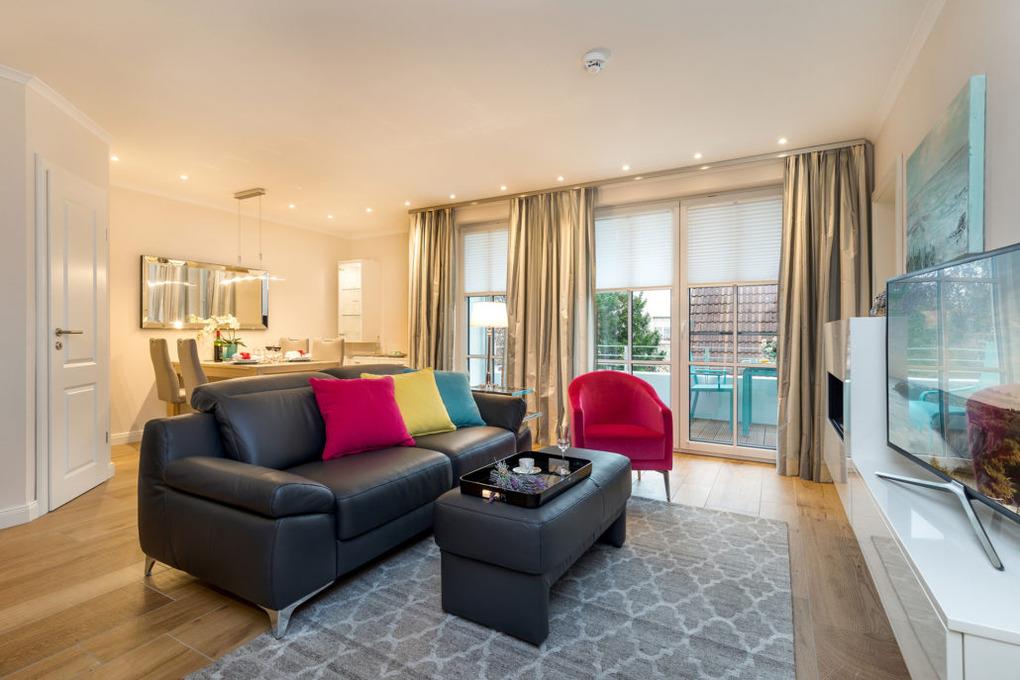 Wohnbereich: Heller Wohnraum mit bequemer Sitzgruppe, elektrischem Kamin, Flachbild-TV und Zugang zum Balkon für entspannte Stunden.