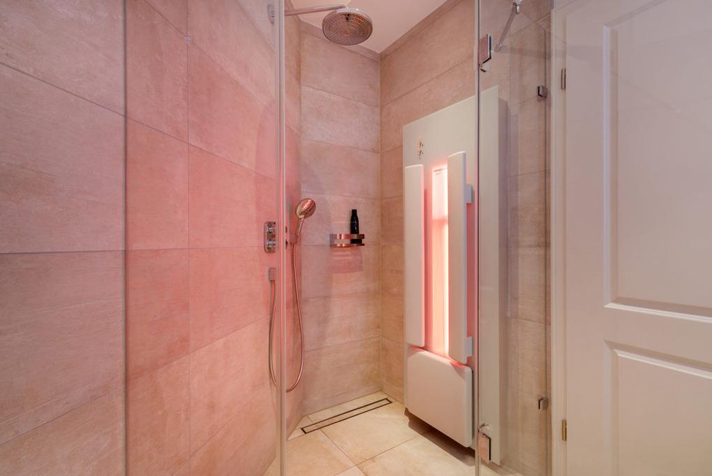Badezimmer: Modernes Bad mit bodengleicher Duschkabine und Infrarot-Dusche von Physiotherm für zusätzlichen Komfort.