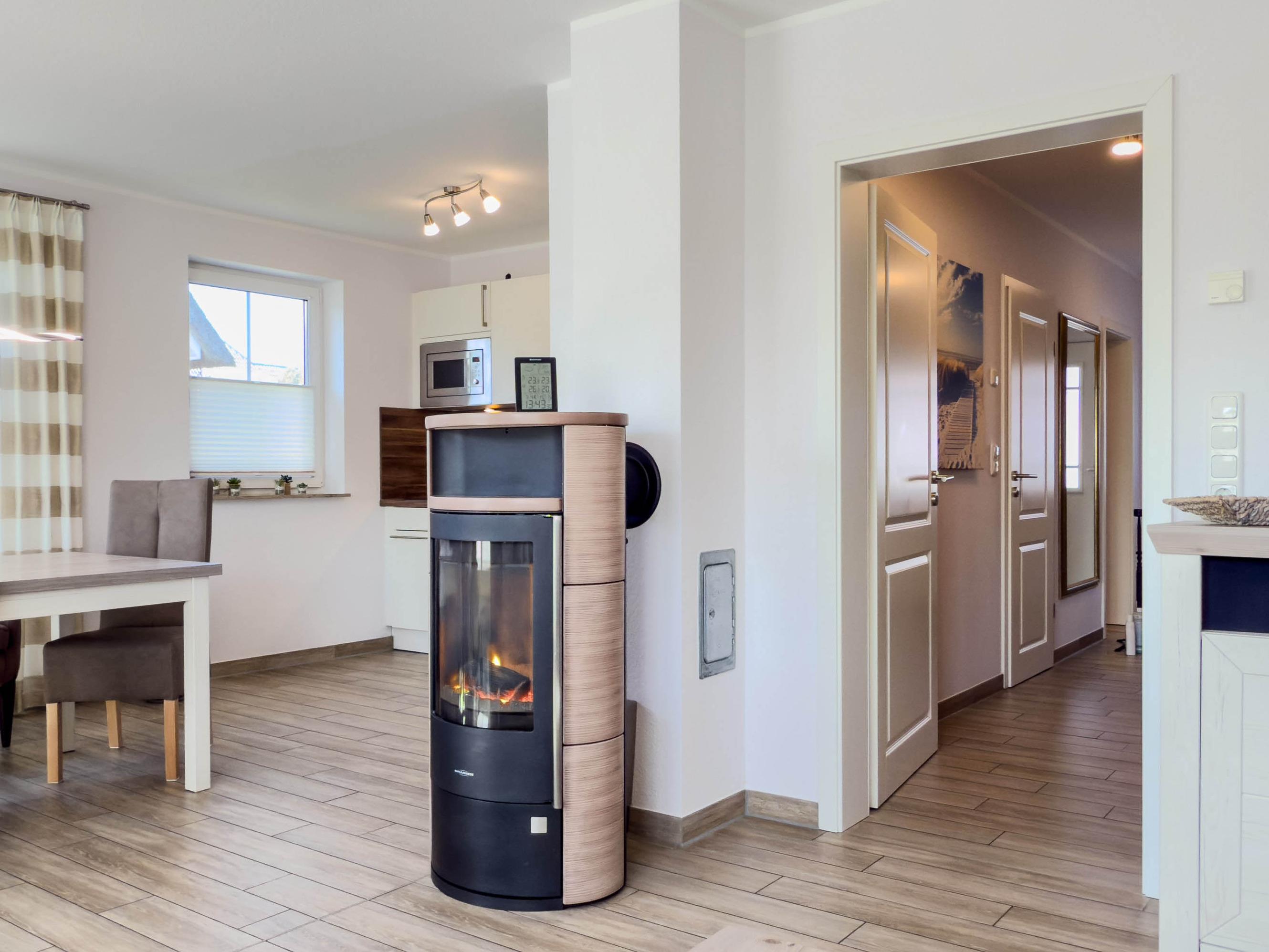 Gemütlicher Wohn-Essbereich mit Kaminofen, Flachbild-TV, Stereoanlage und Blu-ray-Player