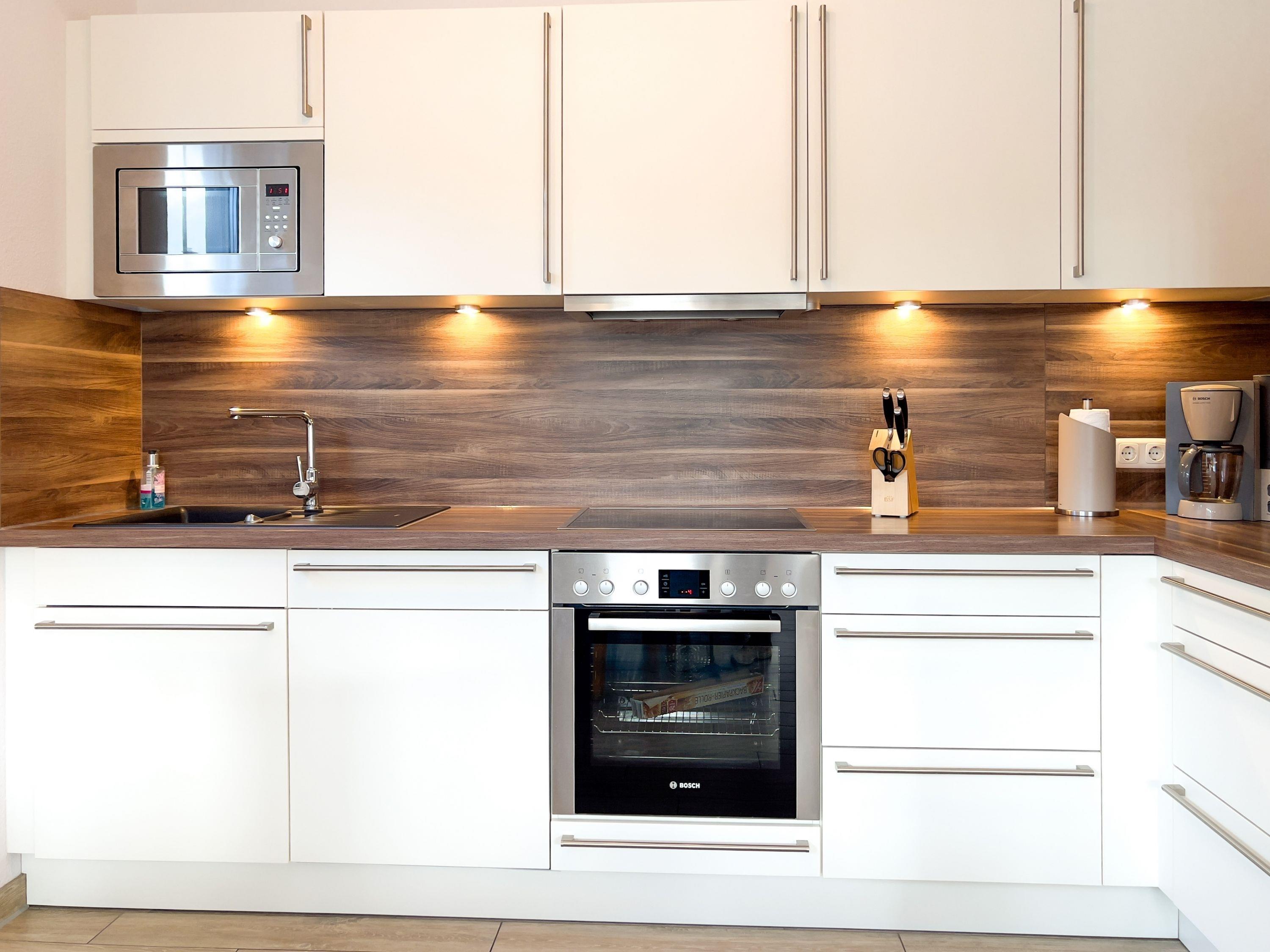 Voll ausgestattete Küche mit Spülmaschine, Mikrowelle, Backofen, Cerankochfeld, großem Kühlschrank, Kaffeemaschine und Cafissimo-Kapselmaschine