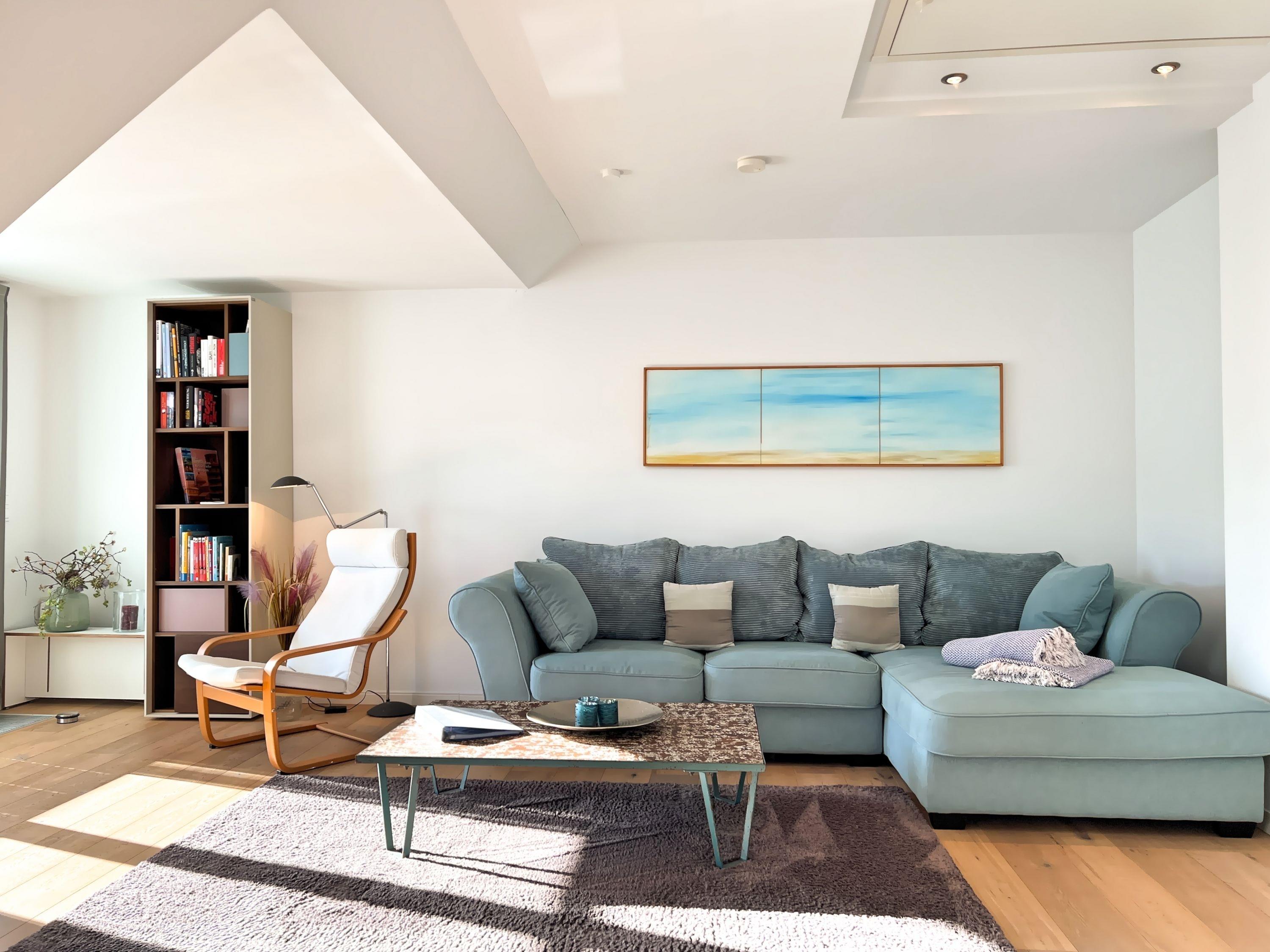 Wohnbereich: Sonnendurchfluteter Wohnraum mit bequemer Eckcouch, Flachbild-TV und Bluetoothbox für entspannte Stunden.