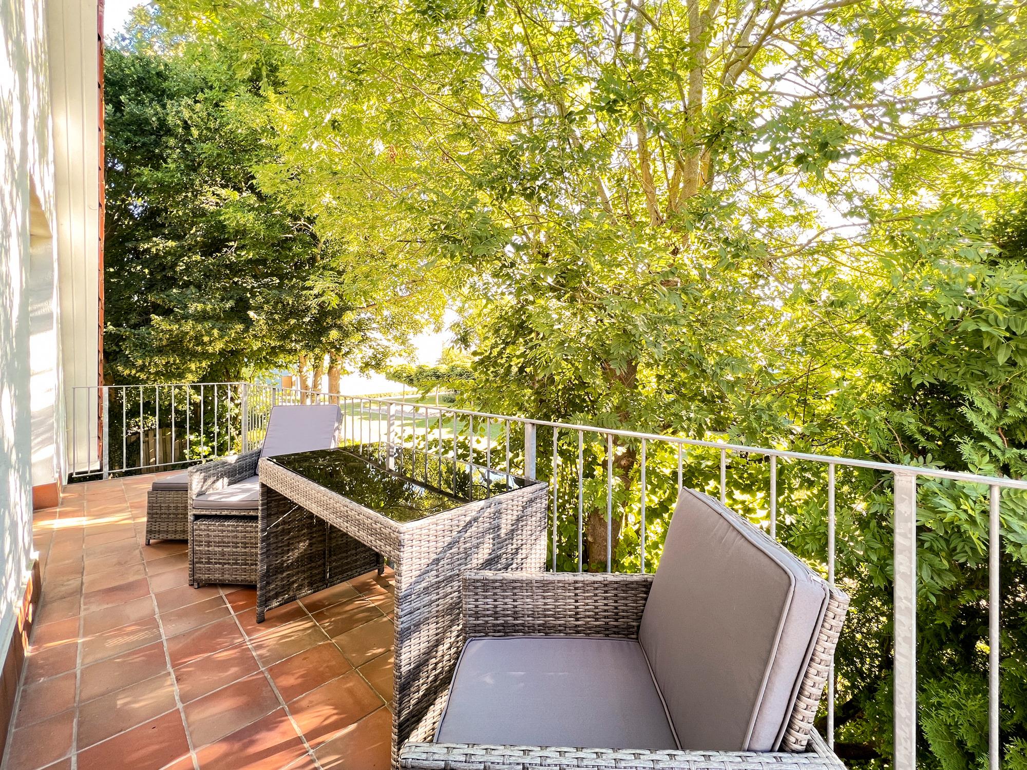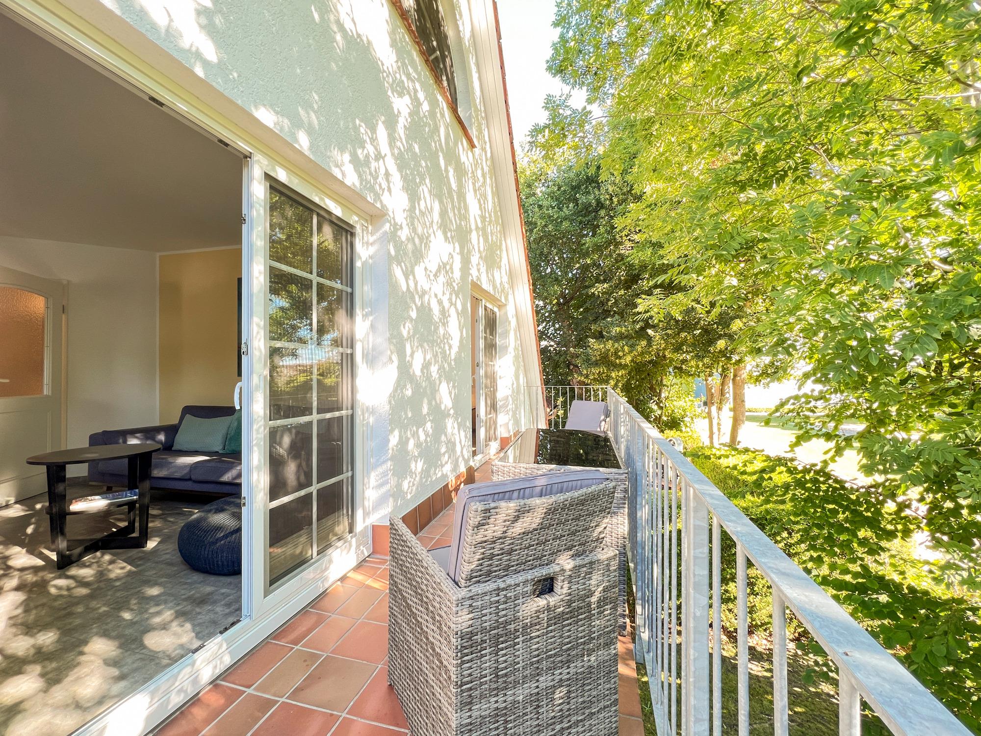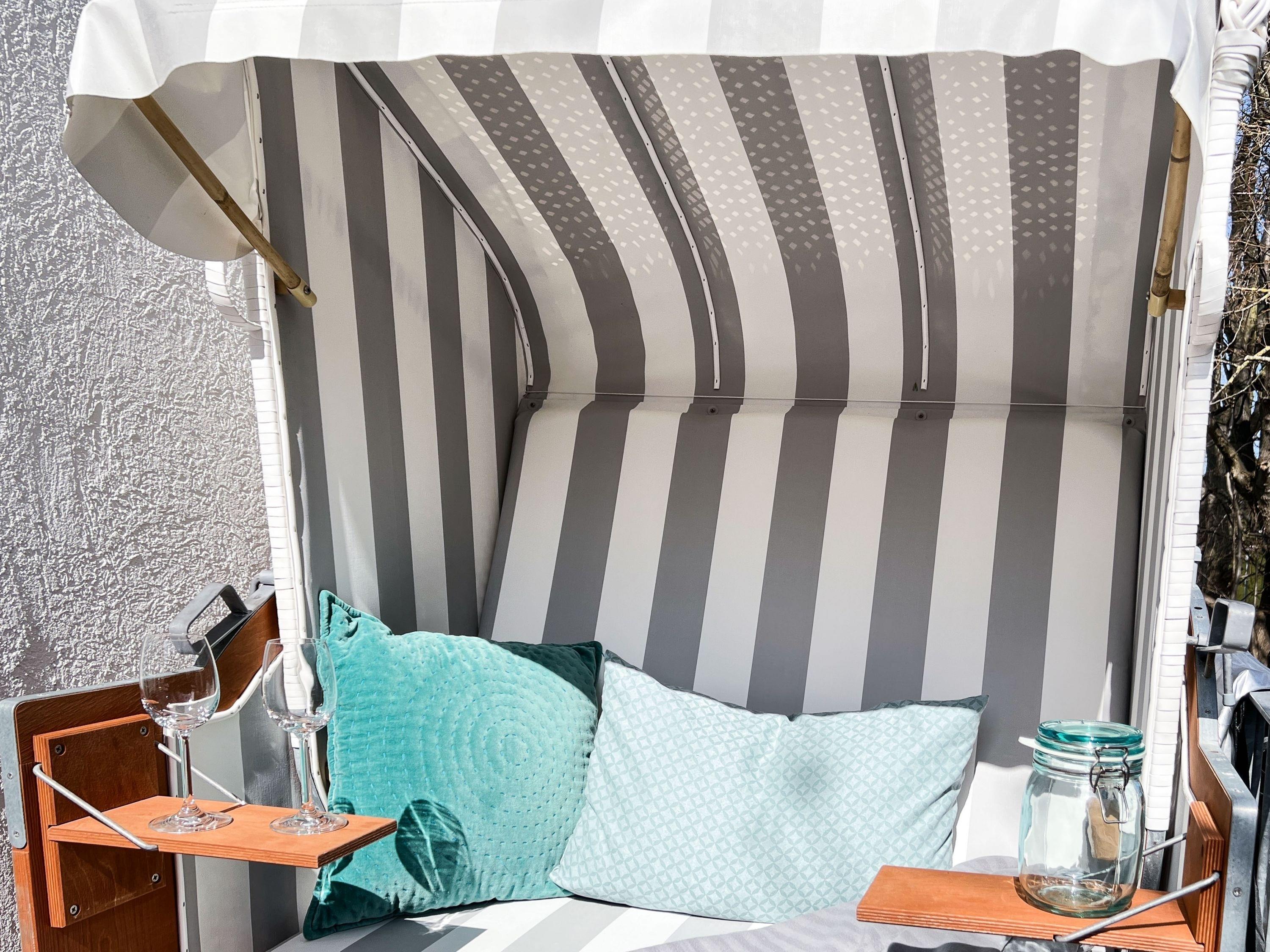 Balkon: Großzügiger Balkon mit gemütlichem Strandkorb und grünem Sichtschutz, ideal zum Entspannen.