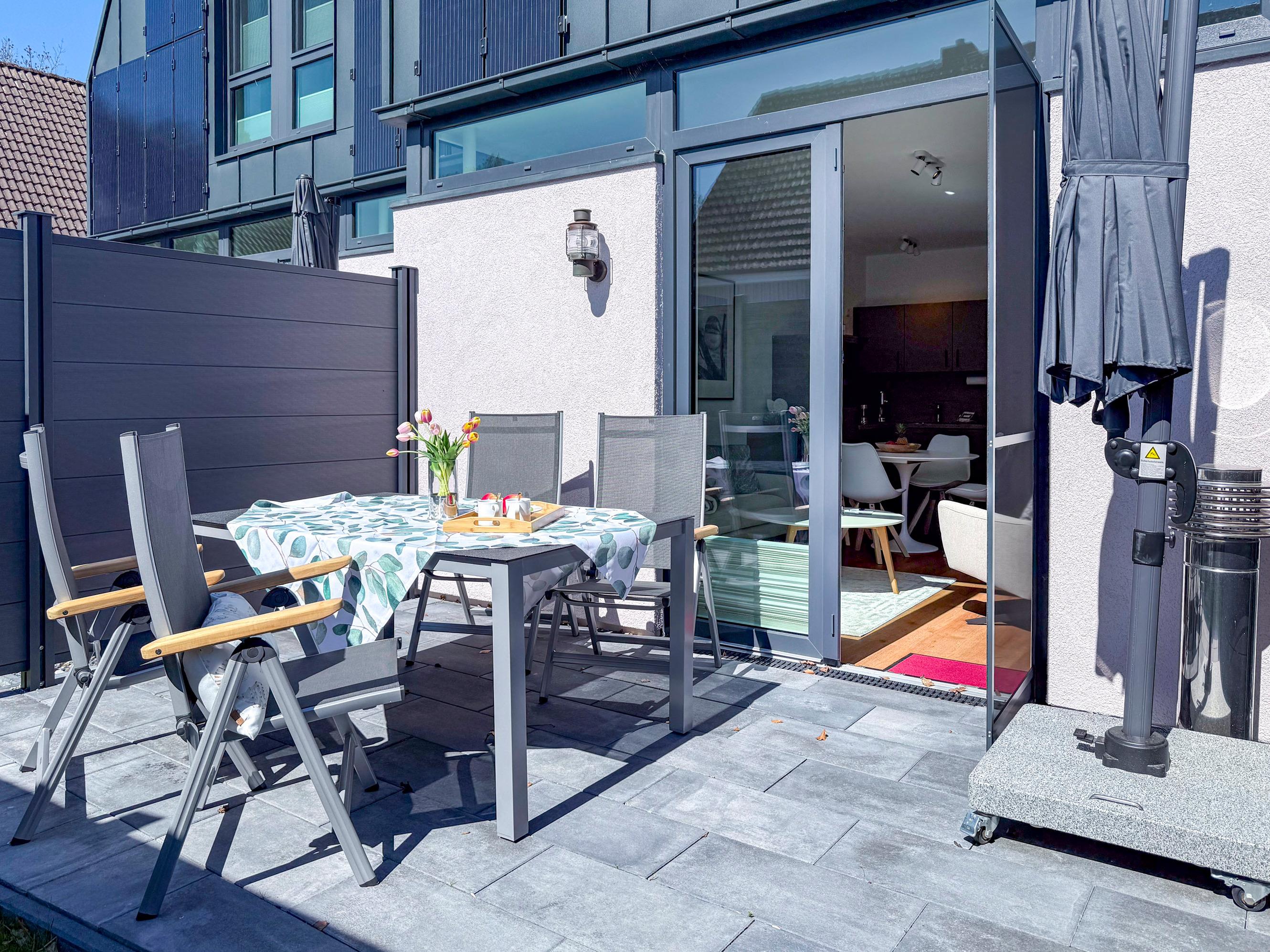 Private Terrasse mit Gartenmöbeln und Sonnenschirm – perfekt für entspannte Stunden im Freien