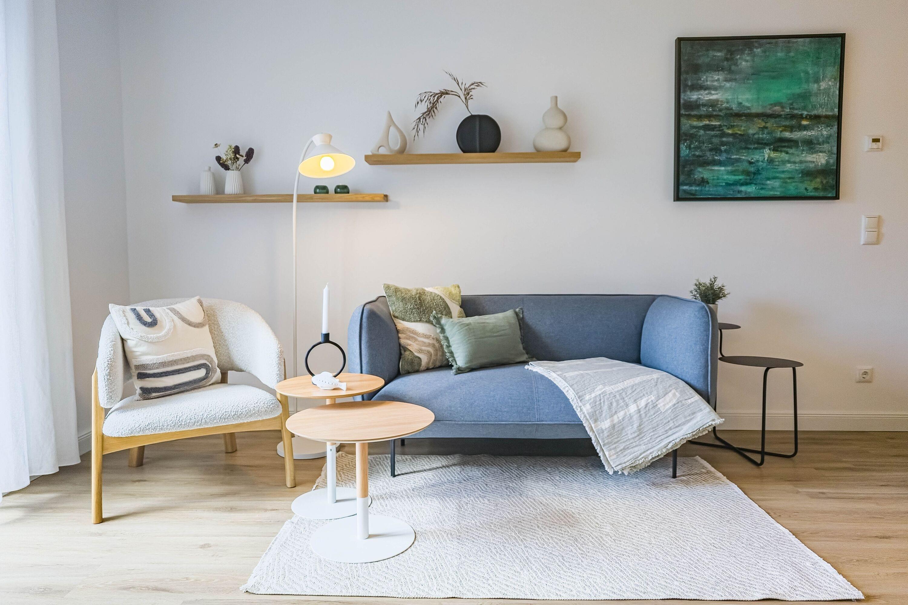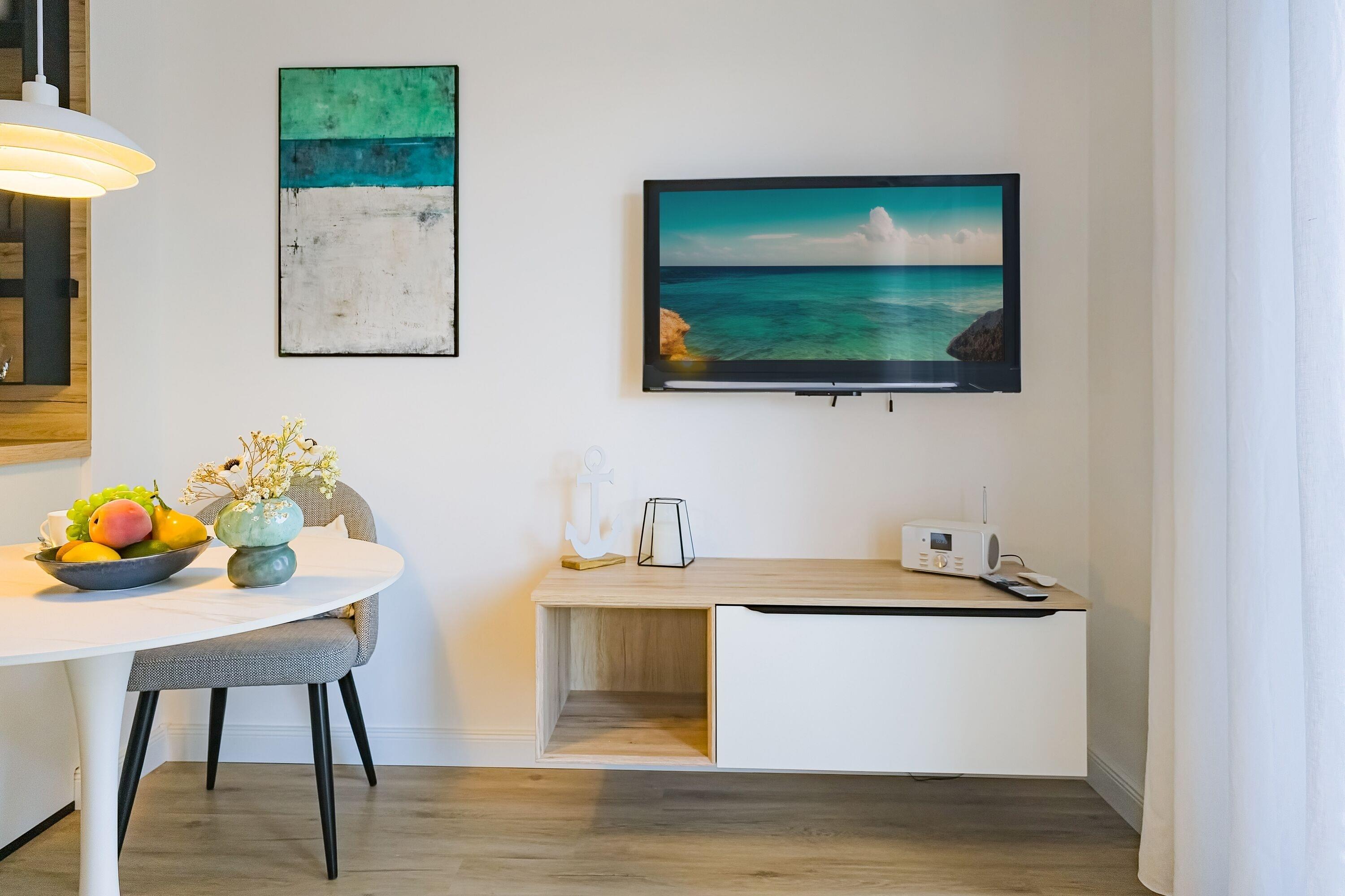 Heller Wohnbereich mit Smart-TV, WLAN, bequemer Sitzgruppe