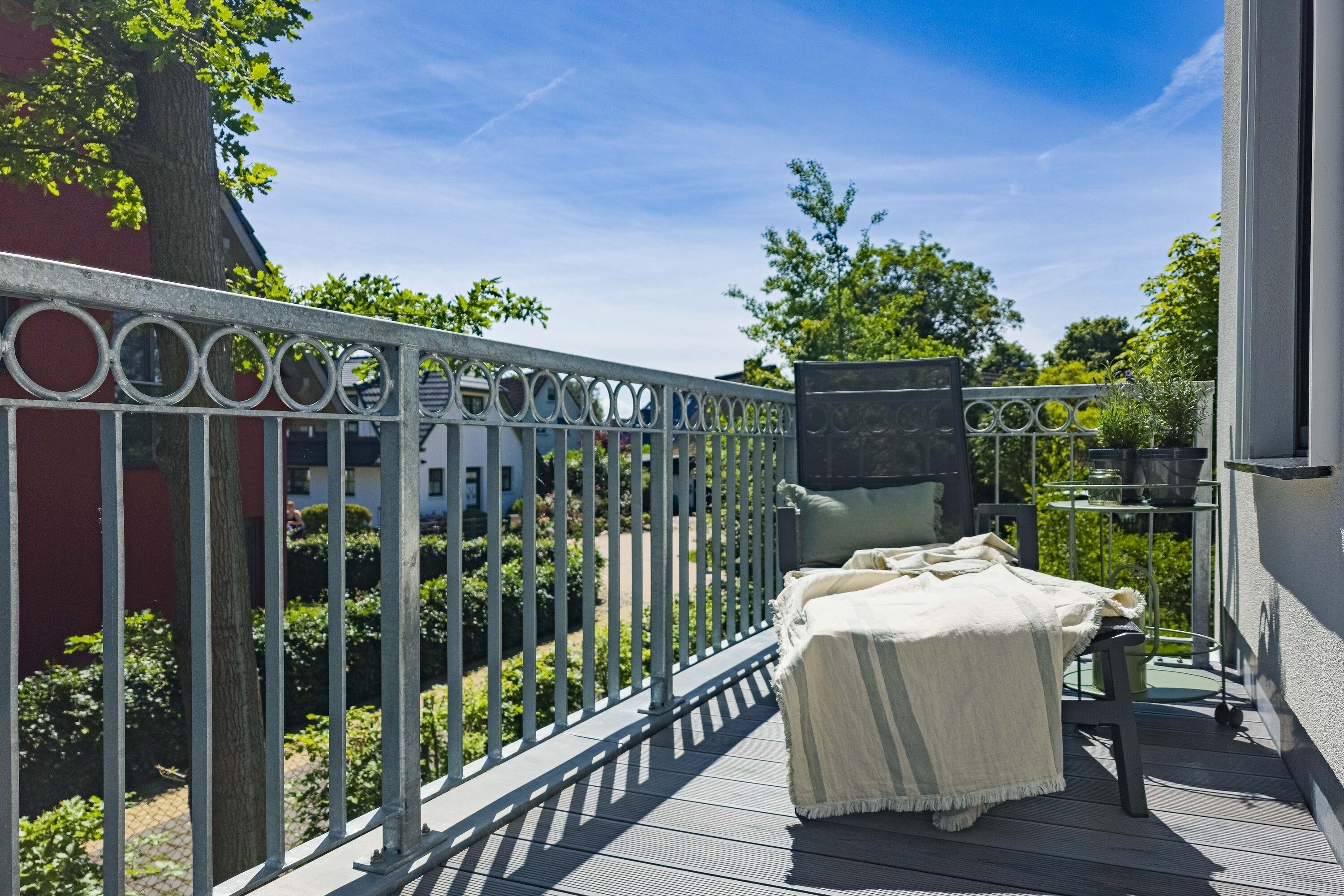 Sonniger Balkon mit Liegen [&] Sonnenschirm