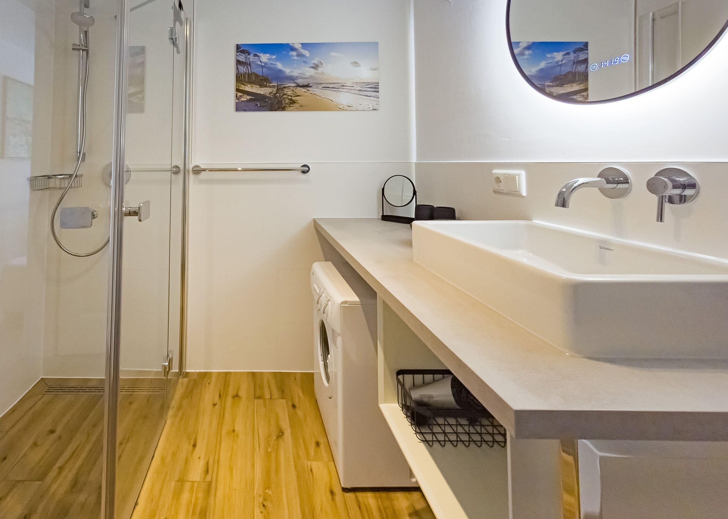 Badezimmer mit ebenerdiger Dusche, Fußbodenheizung, Kosmetikspiegel [&] Handtuchtrockner
