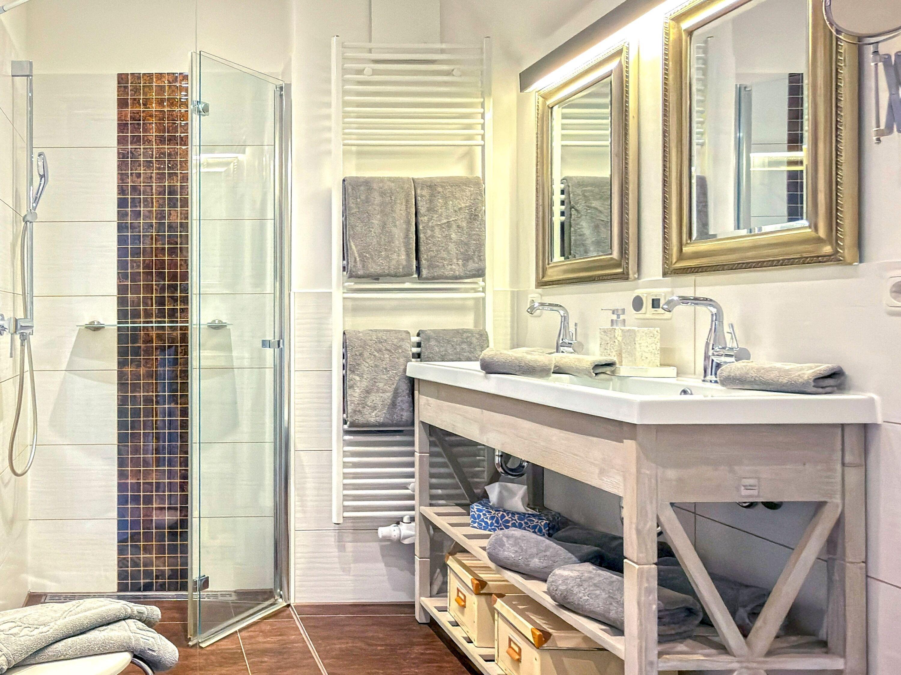 Großzügiges Badezimmer: Mit ebenerdiger Dusche, Doppelwaschbecken und privater Sauna