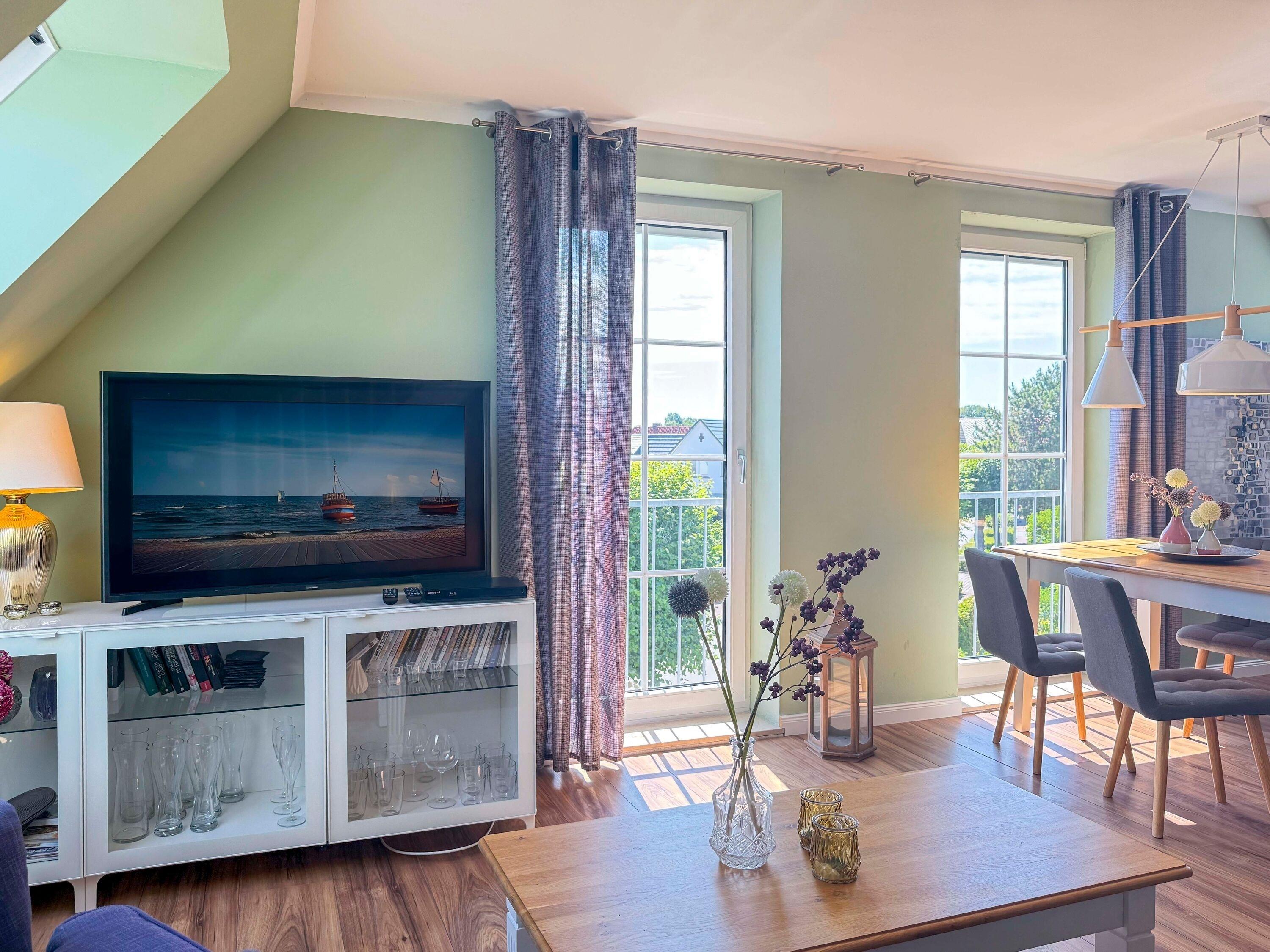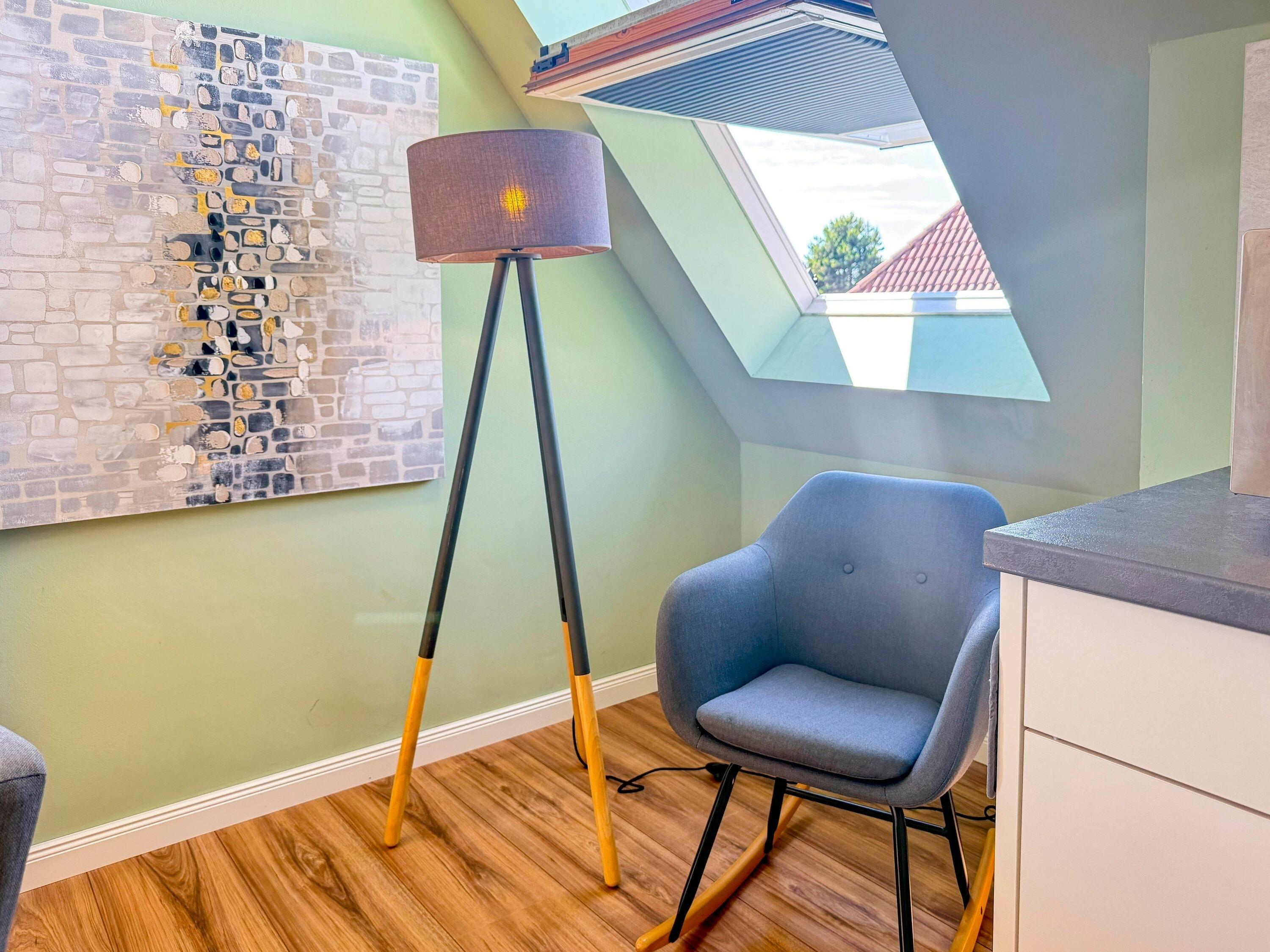 Die Ferienwohnung Meeresrauschen empfängt Sie mit einer harmonischen Mischung aus Komfort und Gemütlichkeit. Der lichtdurchflutete Wohnbereich lädt mit einem bequemen Sofa, Schaukelstuhl und Fernseher zu entspannten Stunden ein. Die offene Küche ist mit allen wichtigen Geräten ausgestattet, damit Sie auch im Urlaub nicht auf gutes Essen verzichten müssen. Am Esstisch lässt sich der Tag bei gemeinsamen Mahlzeiten wunderbar ausklingen.