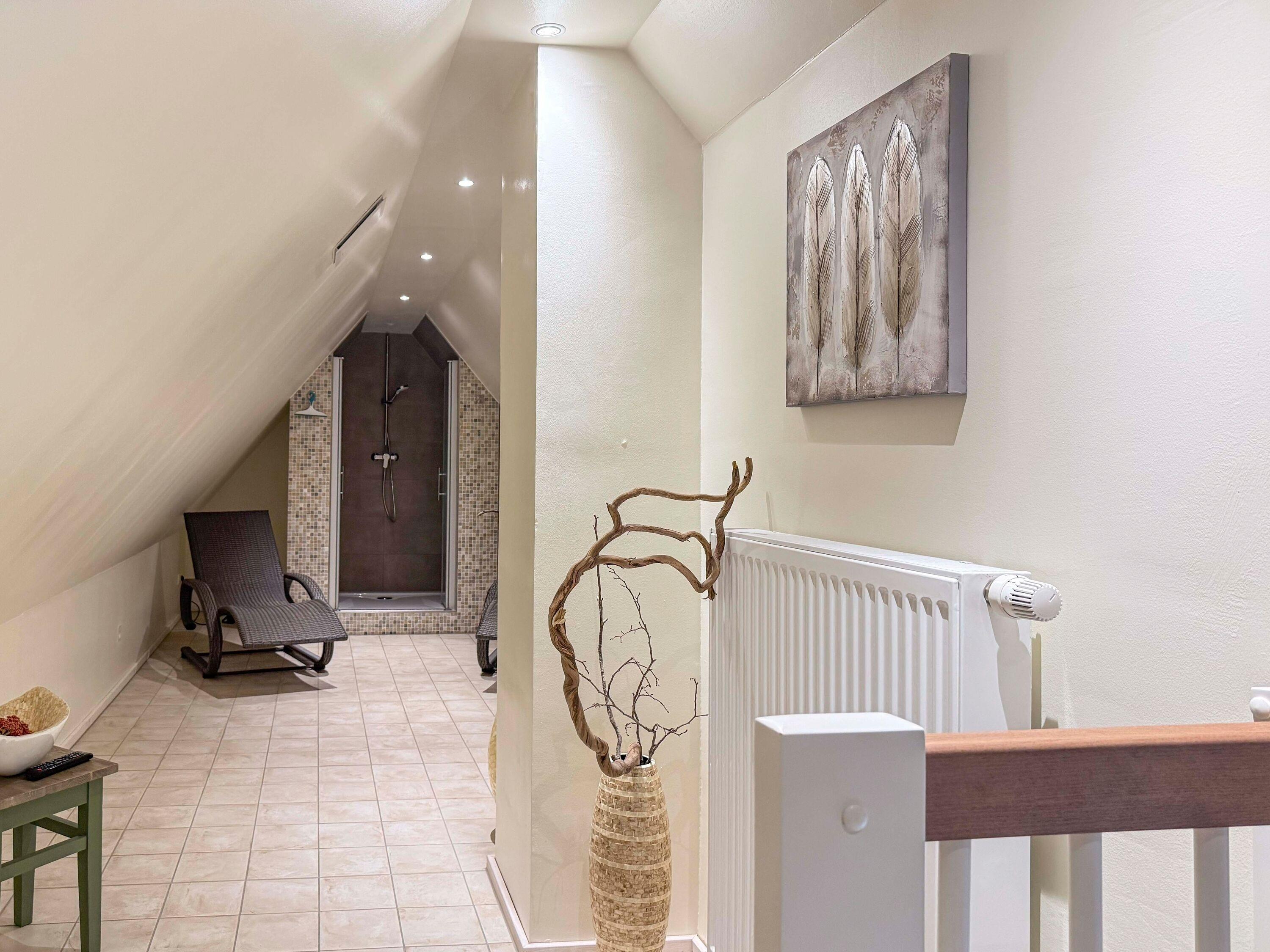 Im gemeinschaftlichen Wellnessbereich erwartet Sie eine moderne Sauna, in der Sie nach einem Tag an der frischen Meeresluft neue Energie tanken können (Nutzung für 2?€ pro Gang). Eine Fußbodenheizung sorgt auch an kühlen Tagen für behagliche Wärme. Auf der Terrasse genießen Sie das Frühstück in der Morgensonne oder lassen bei einem Glas Wein den Abend ausklingen, während Kinder auf der Liegewiese spielen können.