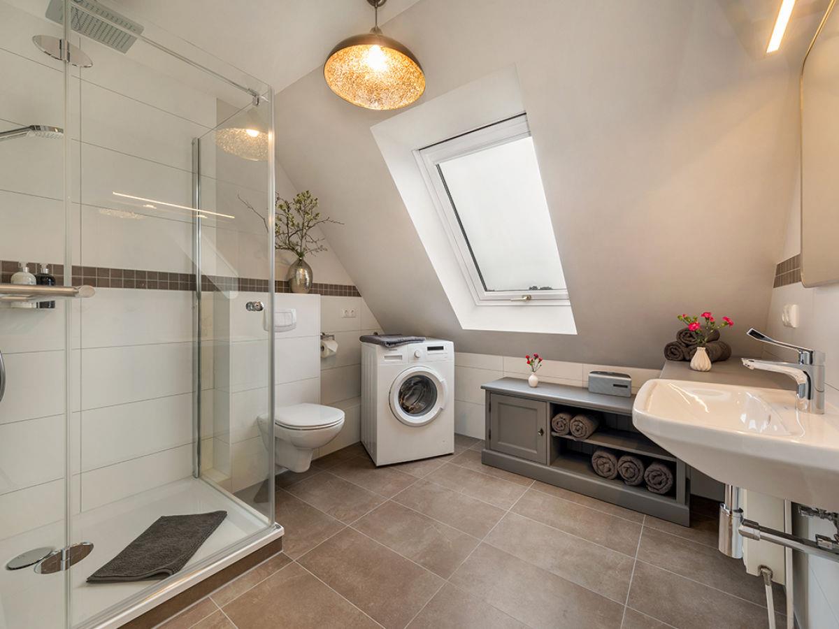 Badezimmer mit Dusche und Waschmaschine