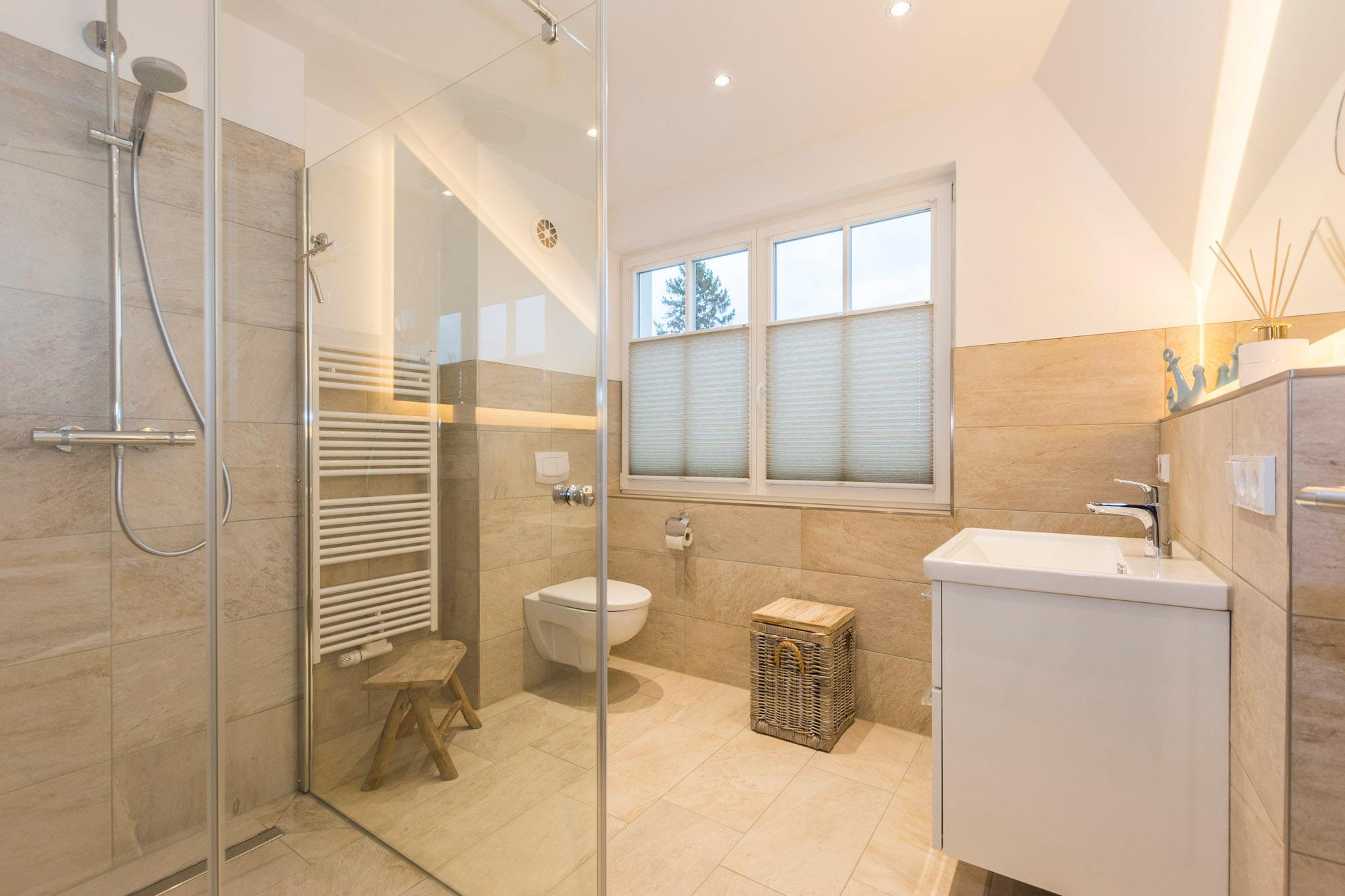 Zwei stilvolle Badezimmer mit bodentiefen Duschen und Fußbodenheizung