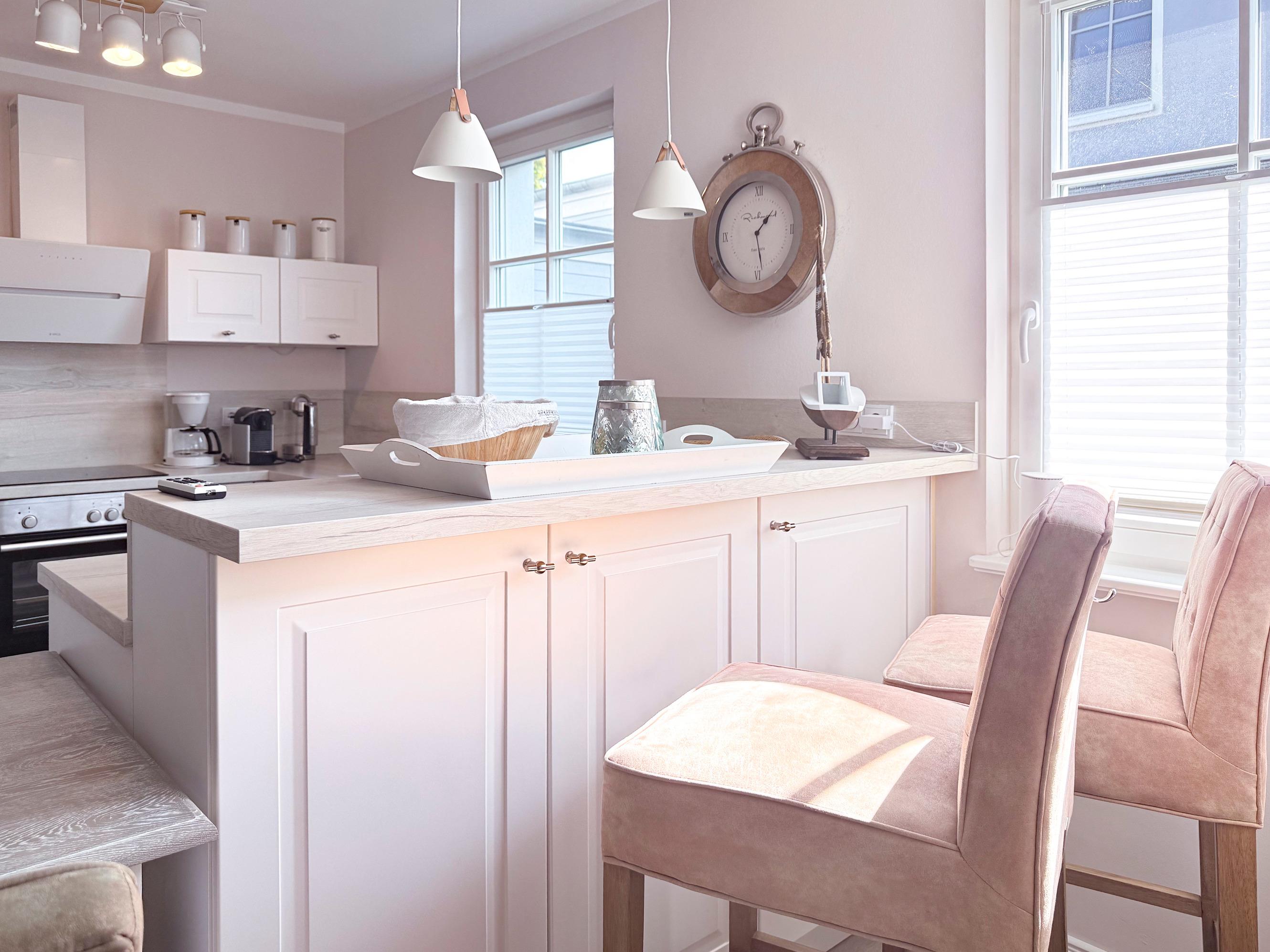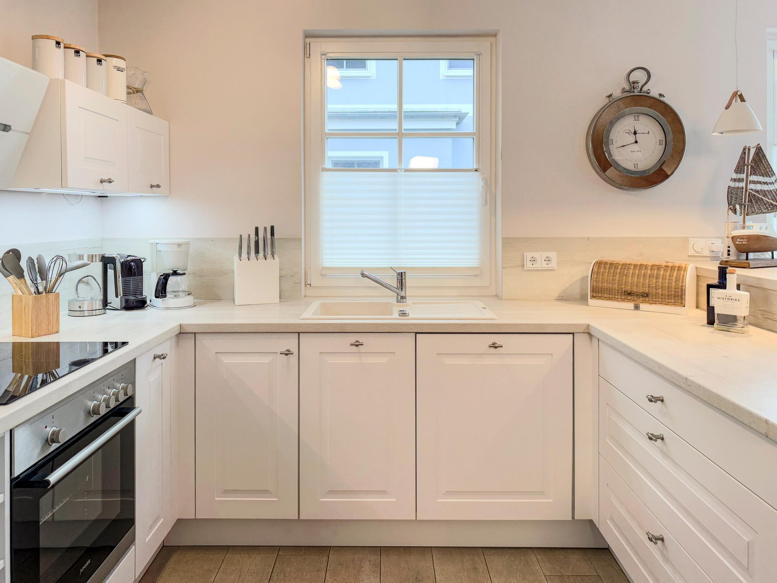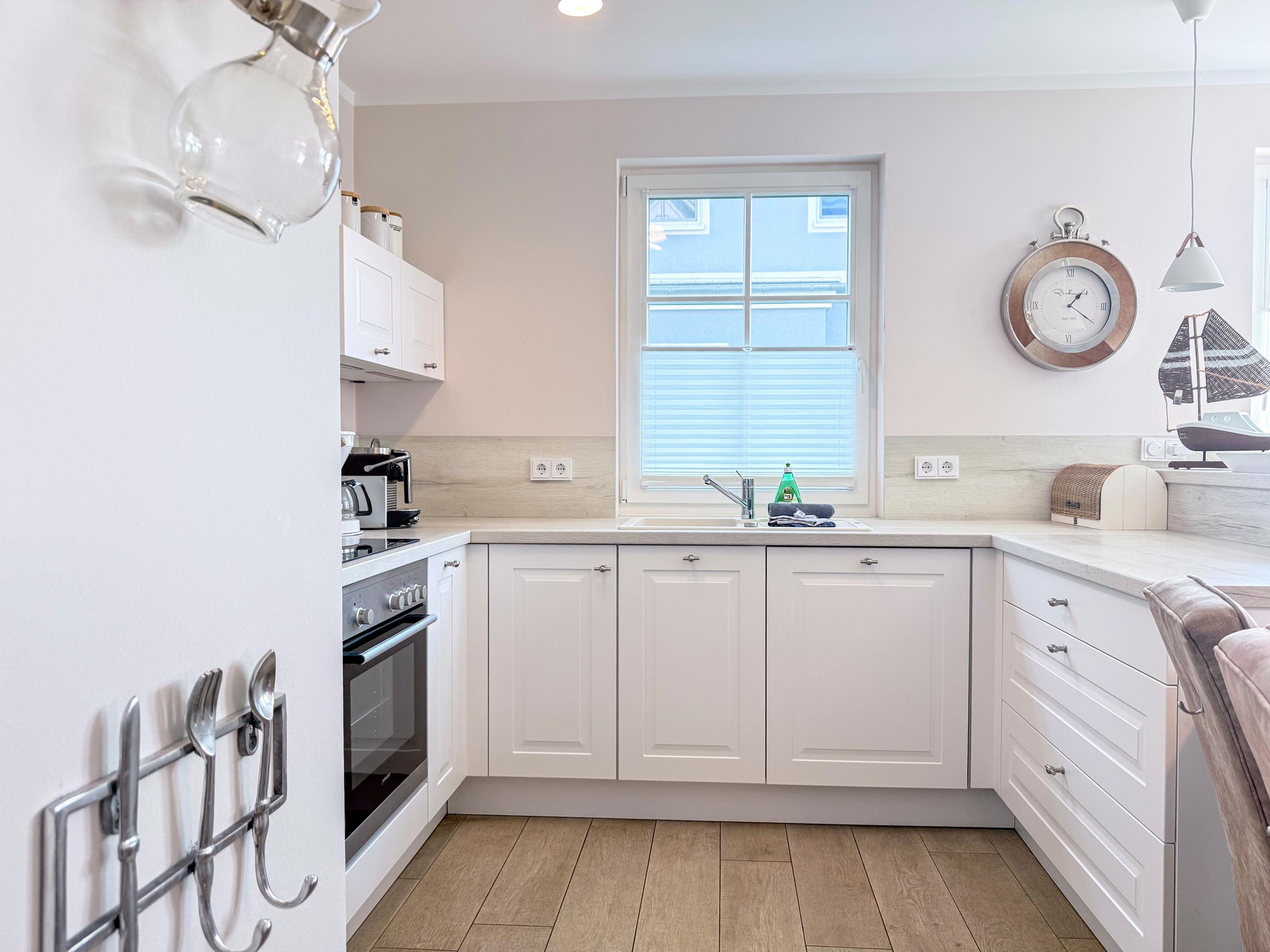 Moderne Küche ausgestattet mit Geschirrspüler, Kaffeevollautomat, Backofen und Mikrowelle