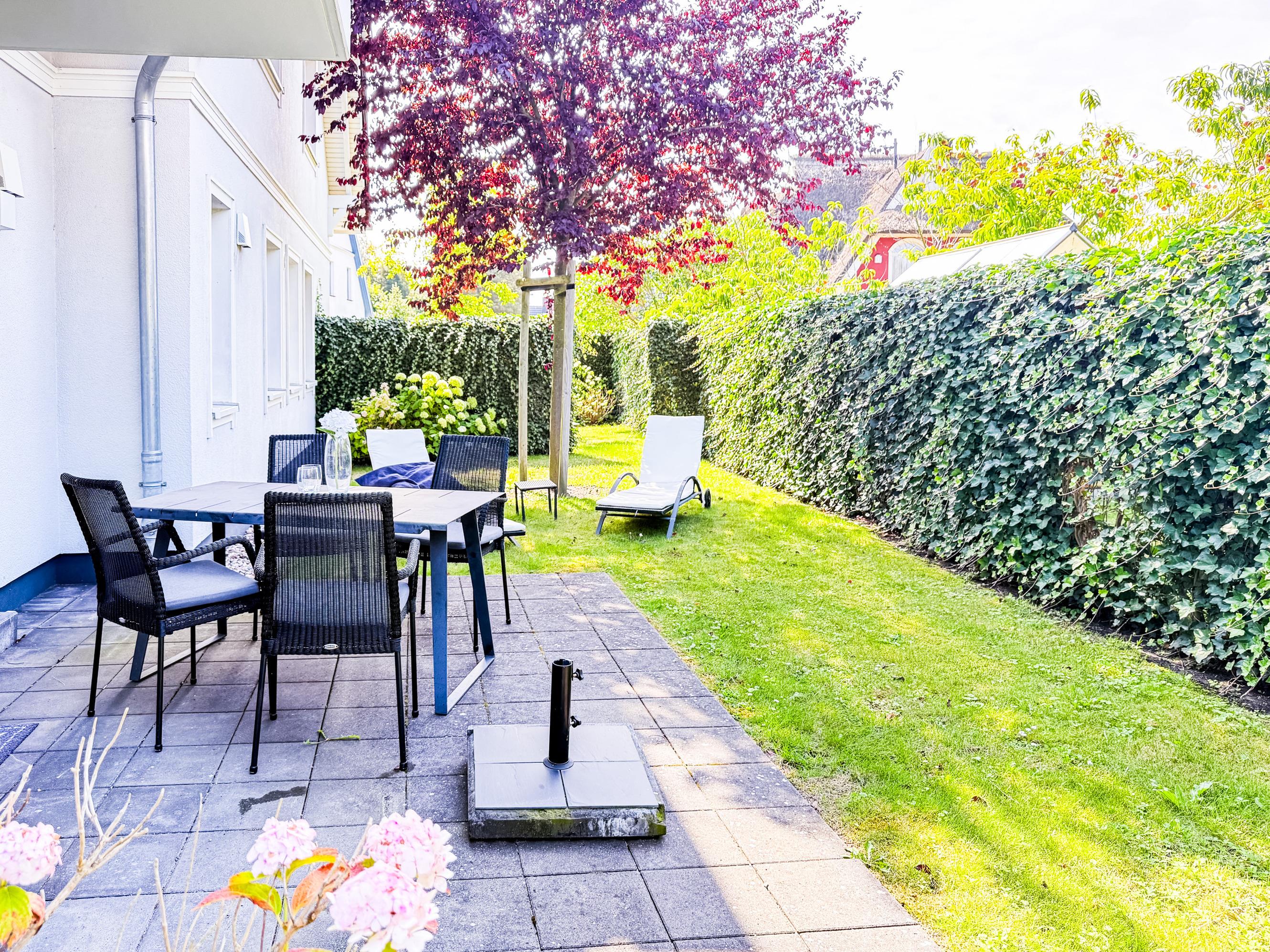 Die private Terrasse mit Blick ins Grüne ist Ihr ganz persönlicher Rückzugsort. Hier können Sie die Sonne genießen, lesen, frühstücken oder einfach die frische Ostseeluft atmen. Die ruhige, aber zentrale Lage verbindet das Beste aus beiden Welten: