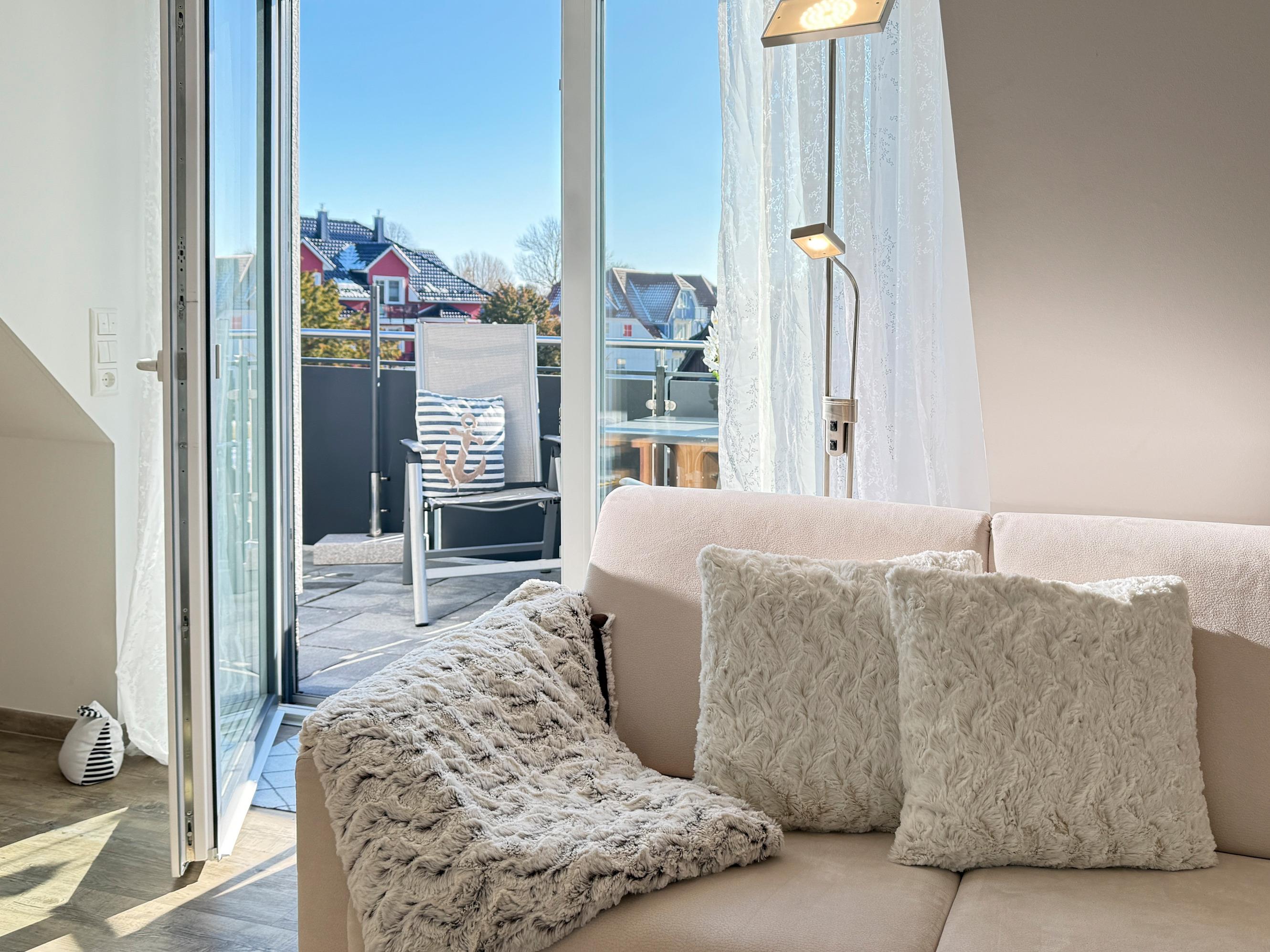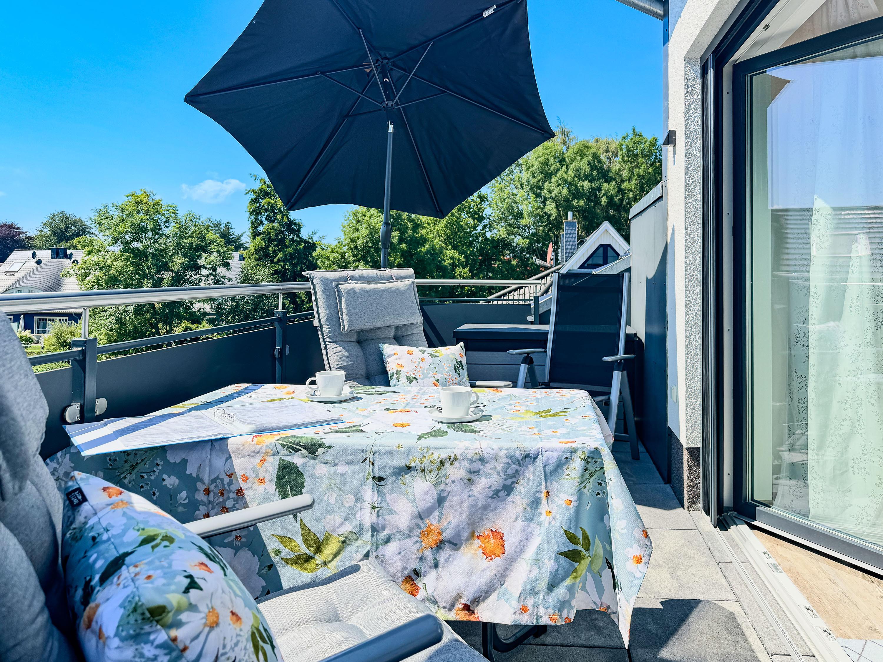 Privater Balkon: Möbliert mit Gartenmöbeln und Sonnenschirm – ideal für entspannte Stunden an der frischen Ostseeluft.