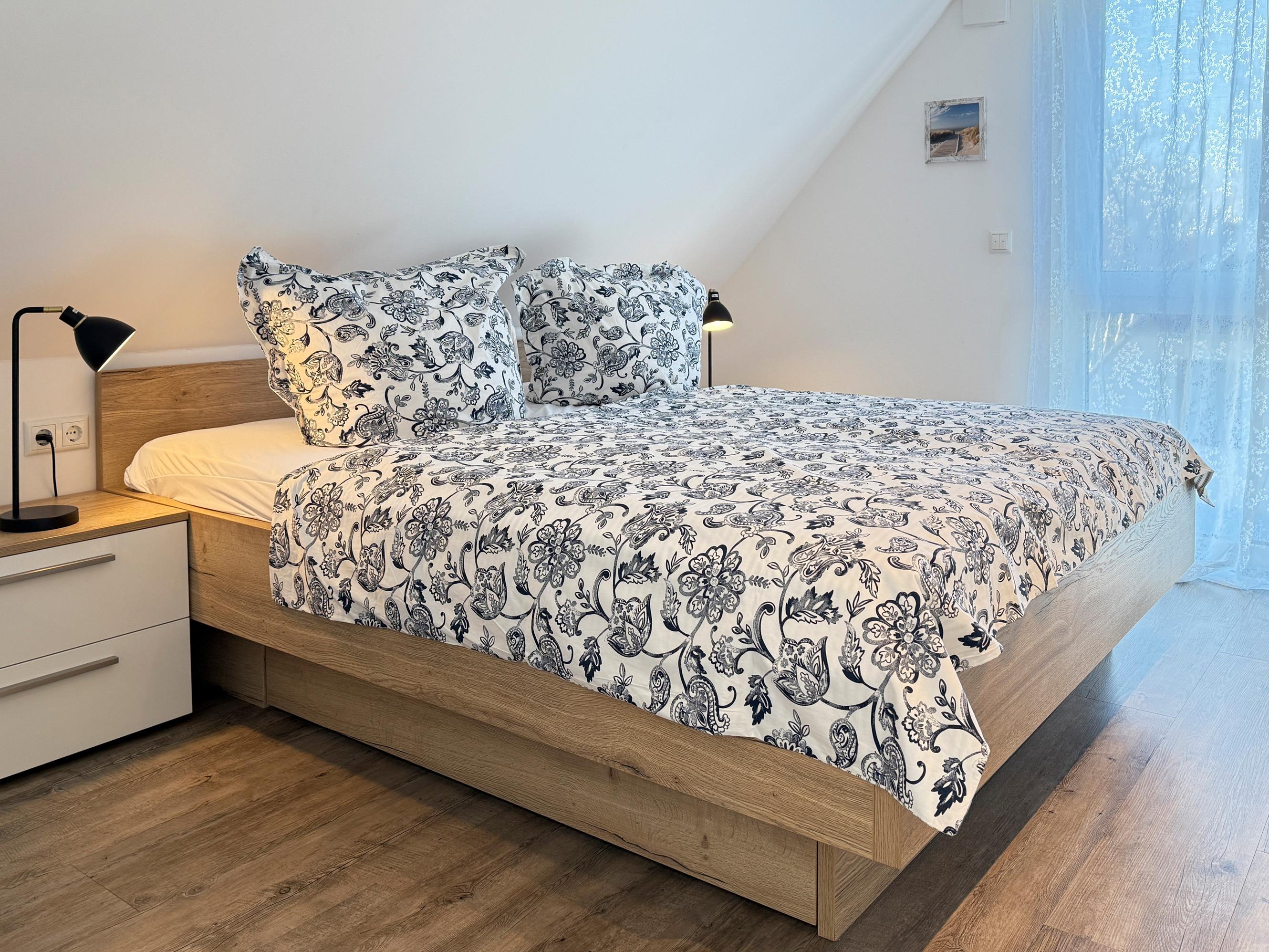 Gemütliches Schlafzimmer: Ausgestattet mit einem komfortablen Doppelbett und großzügigem Kleiderschrank.