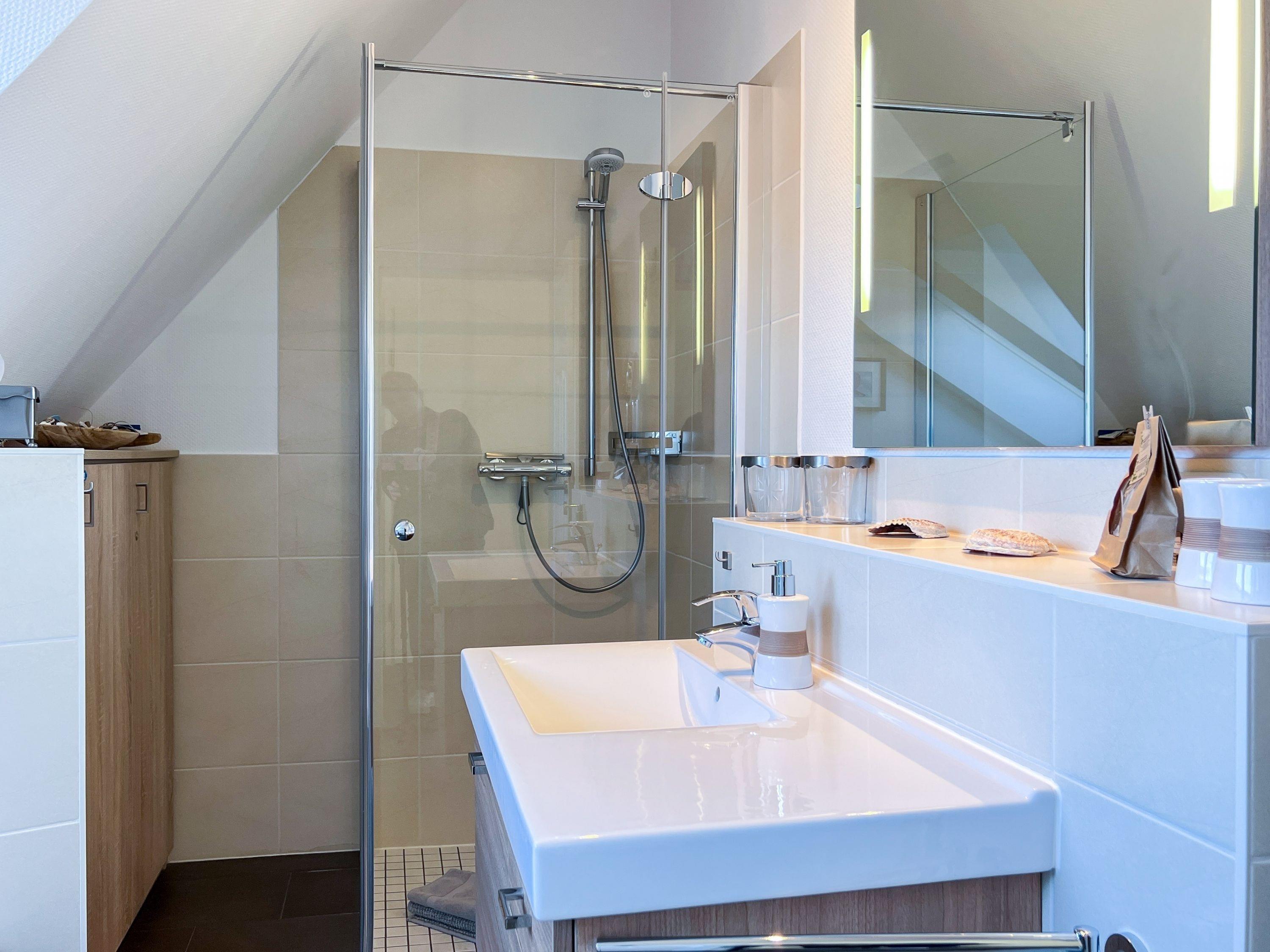 Modernes Badezimmer mit großer Dusche und Fußbodenheizung