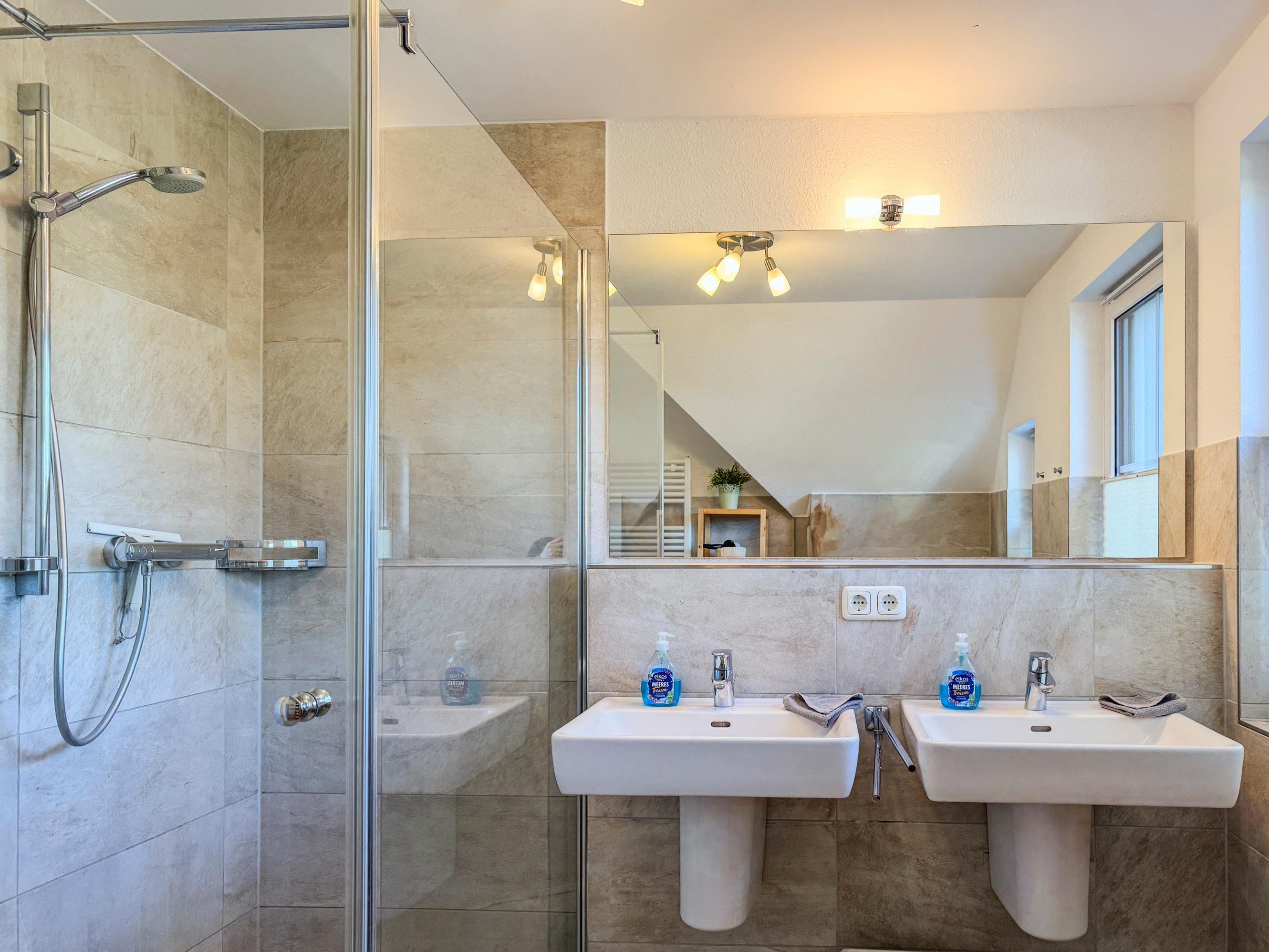 Zwei Badezimmer mit ebenerdigen Duschen