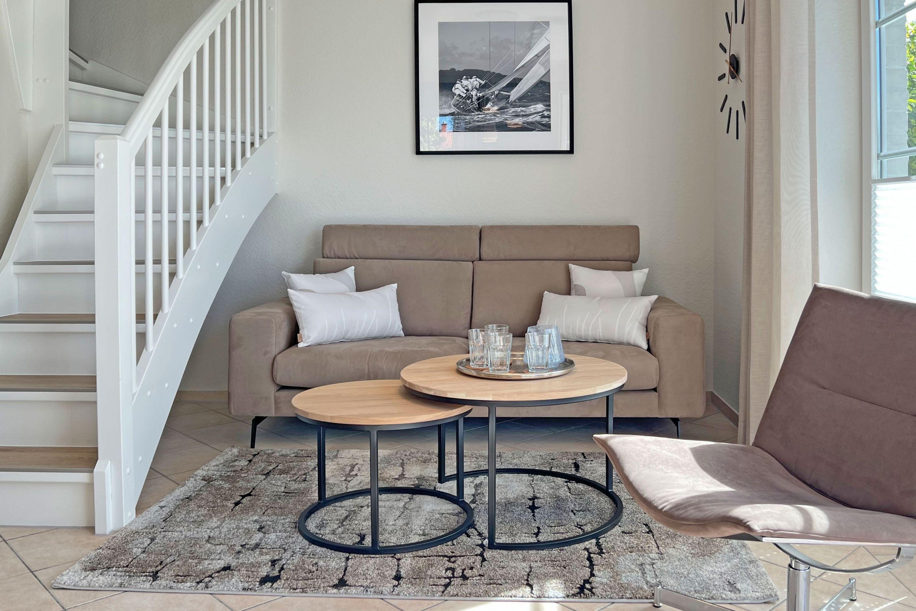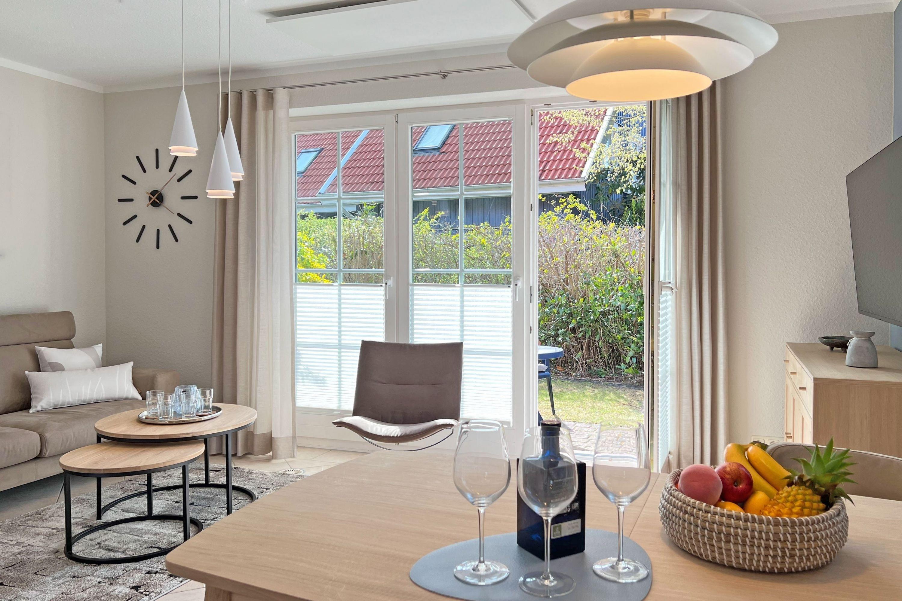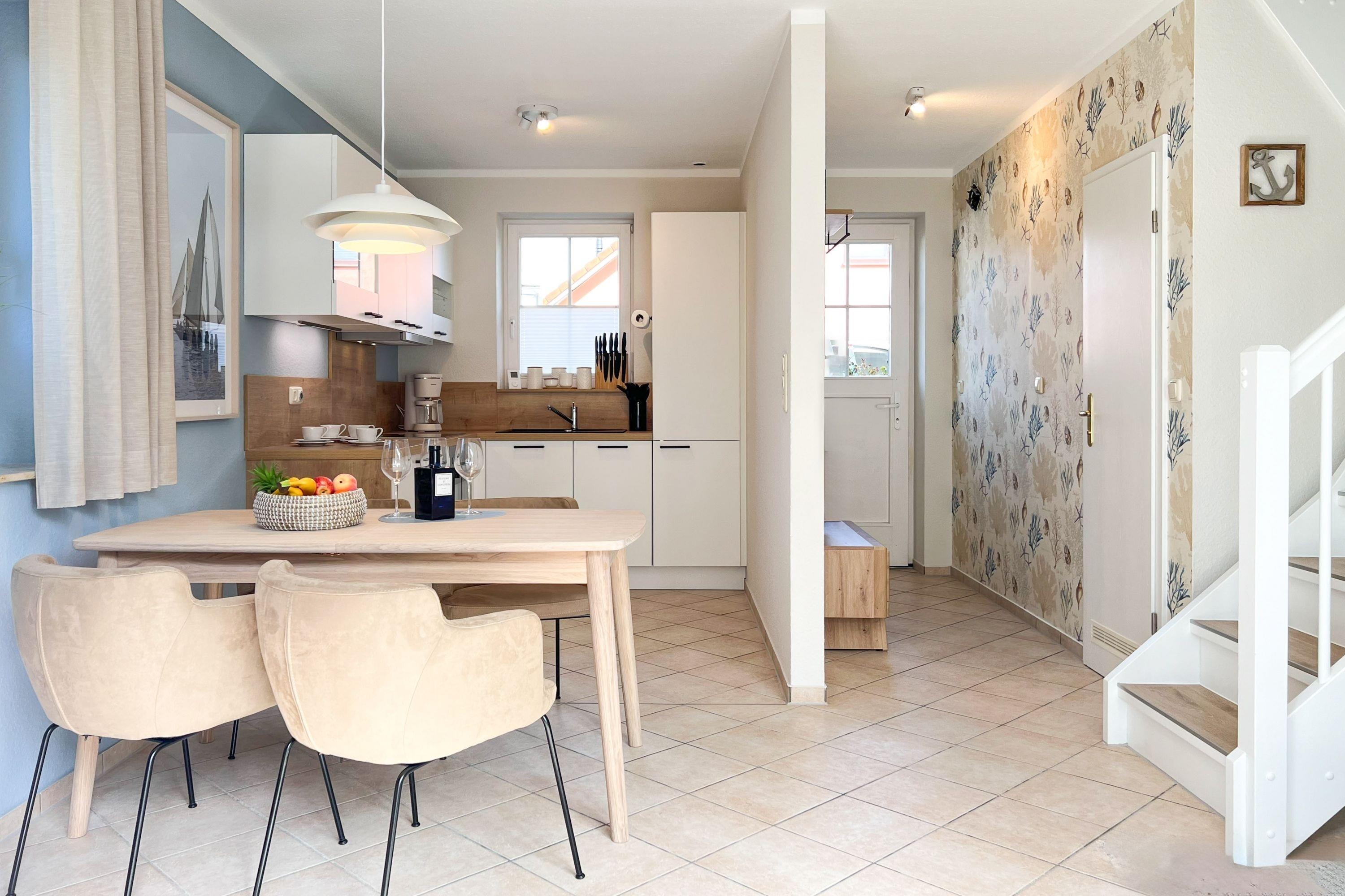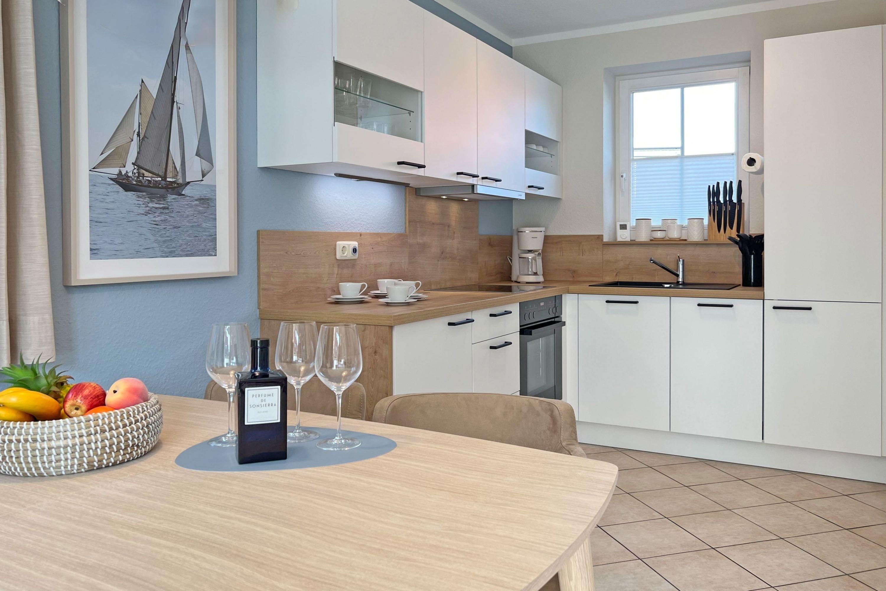 Die Ferienwohnung Sonnenschein empfängt Sie mit einer modernen und einladenden Atmosphäre. Der gemütliche Wohn- und Essbereich im skandinavischen Design bietet den perfekten Ort für entspannte Abende. Die voll ausgestattete Küchenzeile verfügt über moderne Geräte wie Geschirrspüler, Backofen, Kochfeld, Kühlschrank mit Gefriermöglichkeit, Toaster, Wasserkocher und Filterkaffeemaschine, sodass Sie mühelos kulinarische Köstlichkeiten zubereiten können. Die beiden separaten Schlafzimmer sorgen für erholsamen Schlaf.