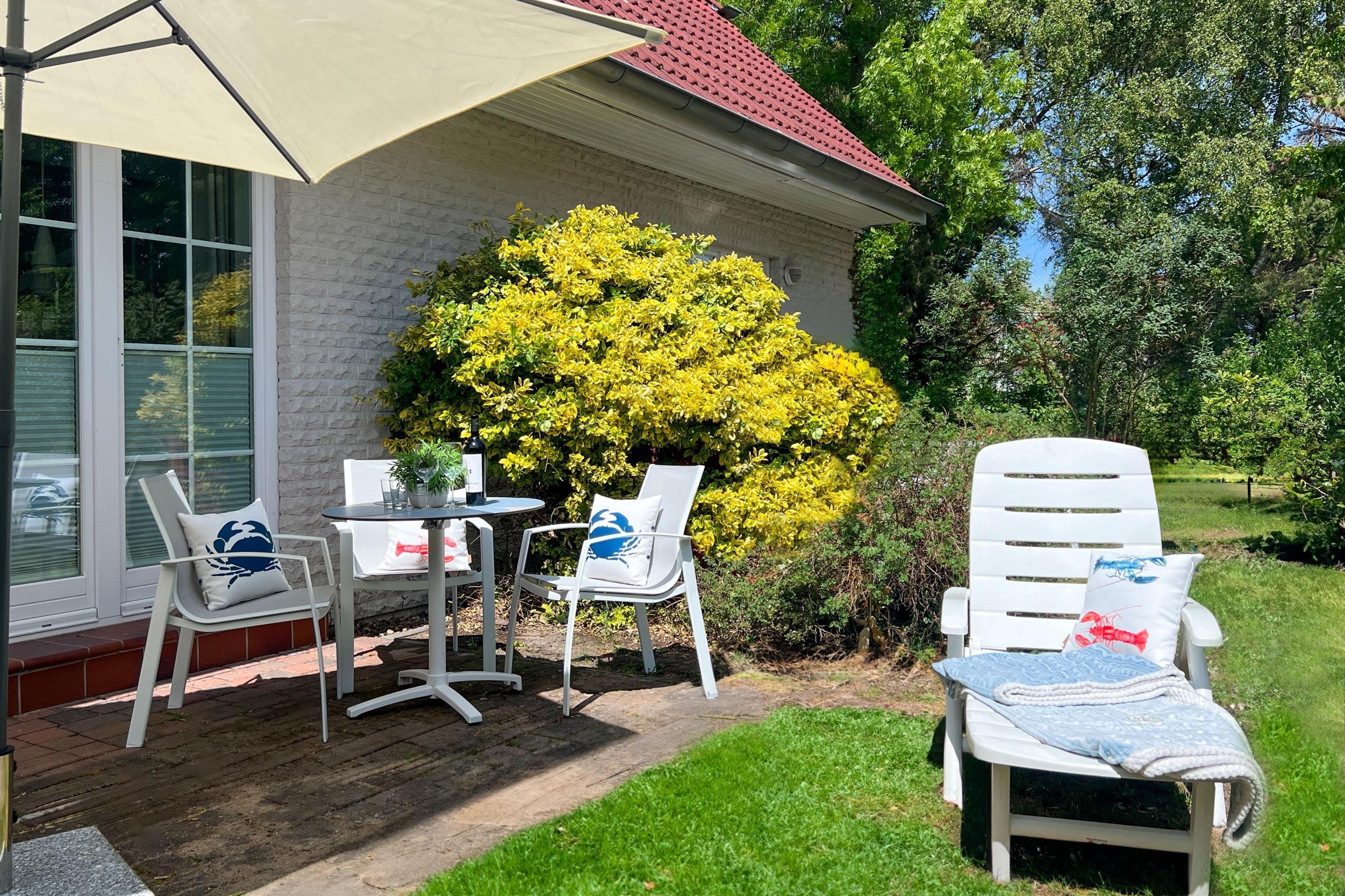 Genießen Sie die frische Ostseeluft auf der westlich ausgerichteten Terrasse mit Blick ins Grüne. Hier können Sie den Tag mit einem Frühstück im Freien beginnen oder abends die letzten Sonnenstrahlen bei einem Glas Wein ausklingen lassen. Ein Sonnenschirm steht für gemütliche Stunden im Freien zur Verfügung.