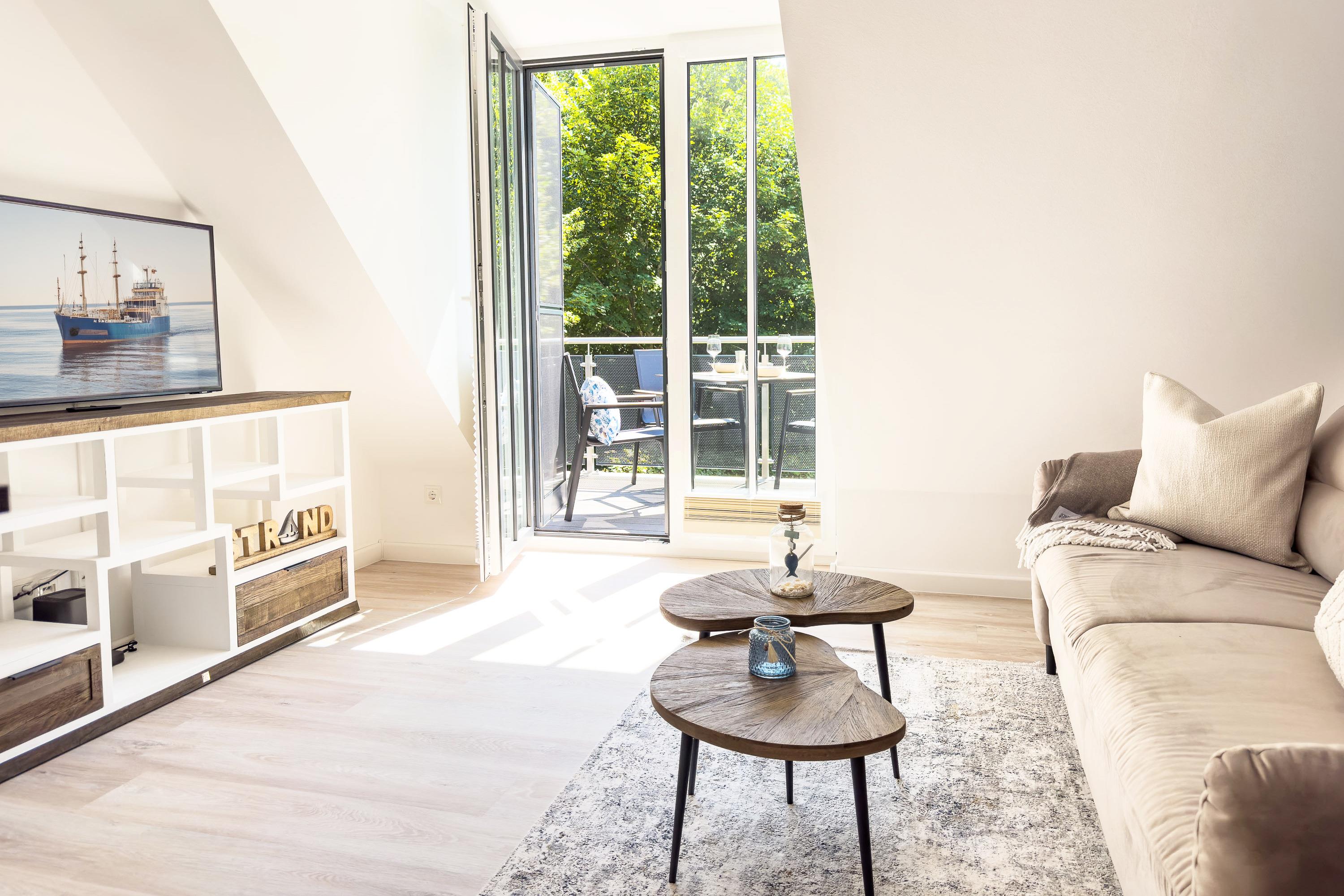 Genießen Sie die frische Ostseeluft auf dem Balkon mit Blick ins Grüne. Hier können Sie den Tag mit einem Frühstück im Freien beginnen oder abends bei einem Glas Wein ausklingen lassen.