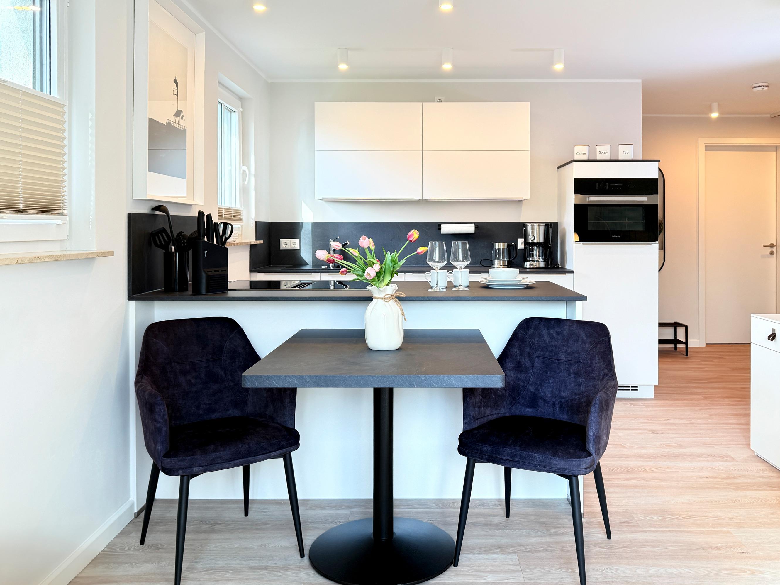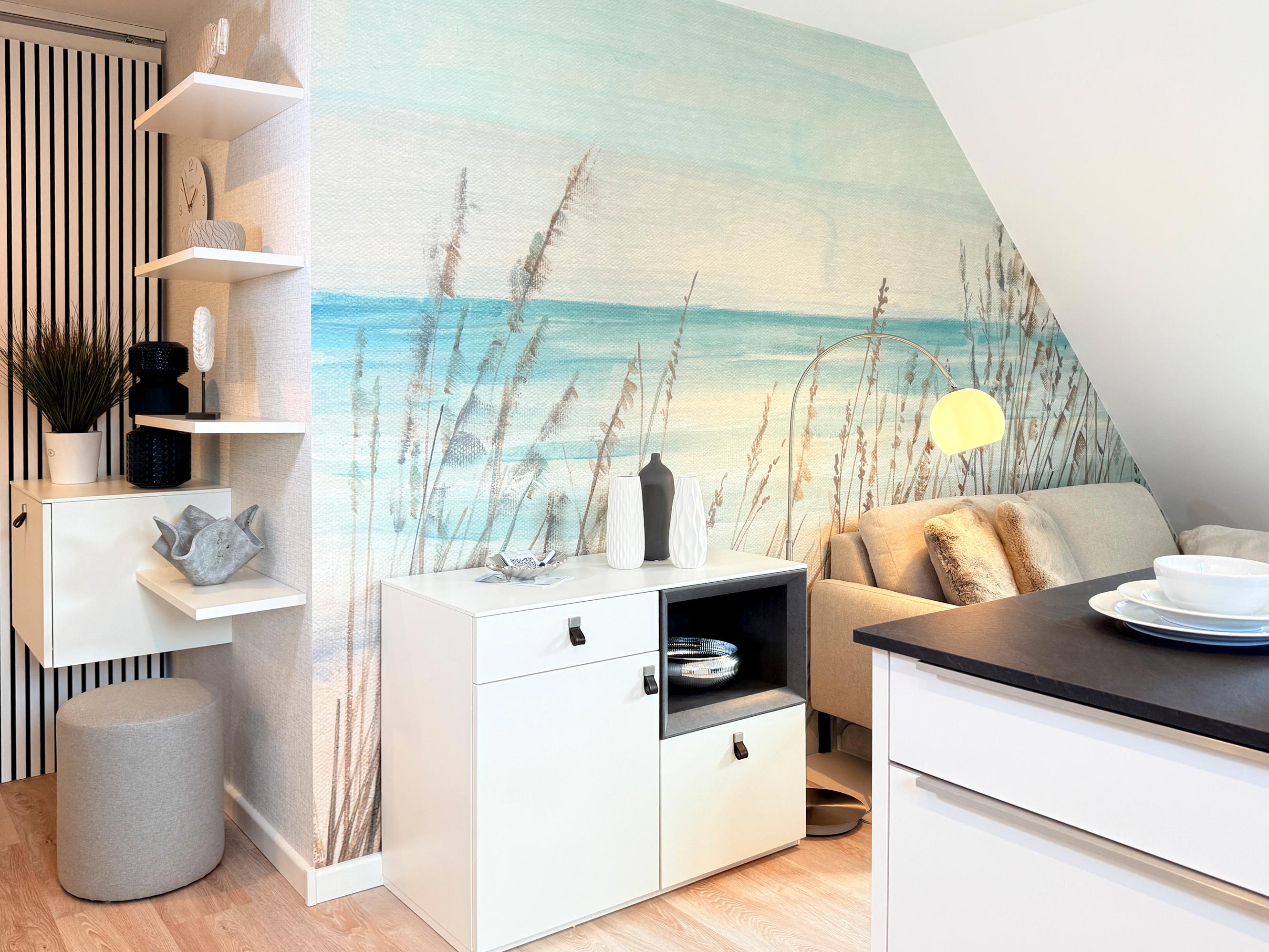 Die Ferienwohnung Störtebekerkoje 12a/6 empfängt Sie mit einer modernen und einladenden Atmosphäre. Der gemütliche Wohn- und Essbereich bietet den perfekten Ort für entspannte Abende. Die gut ausgestattete Küchenzeile verfügt über moderne Geräte wie Geschirrspüler, Mikrowelle, Kühlschrank, Toaster, Wasserkocher und Filterkaffeemaschine, sodass Sie mühelos kulinarische Köstlichkeiten zubereiten können. Das separate Schlafzimmer sorgt für erholsamen Schlaf.